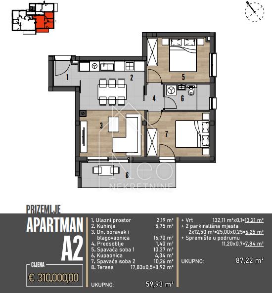 Ovaj apartman se sastoji od ulaznog prostora, kuhinje, dnevnog boravka i blagovaonice, predsoblja, dvije spavaće sobe te kupaonice. Iz dnevnog boravka se izlazi na terasu od 17,83m2 te u vrt površine 132,11 m2. Apartman je površine 59,93 m2.