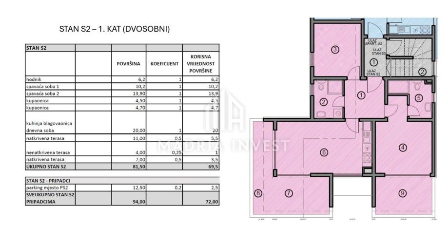 Tlocrti svih dvosobnih stanova ovog projekta su koncipirani tako da mogu funkcionirati kao cjelina s dvije spavaće sobe, 2 kupaonice, velikim open - space dnevnim dijelom, te dvije komforne terase.