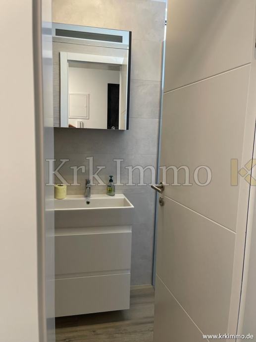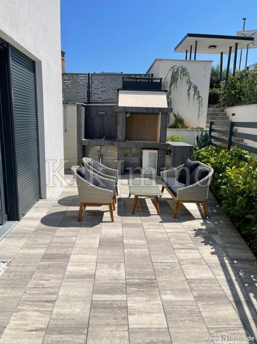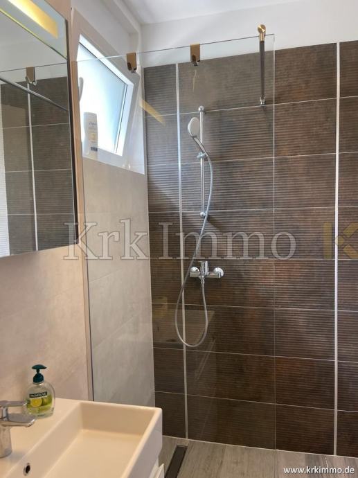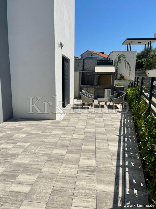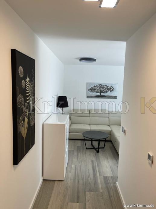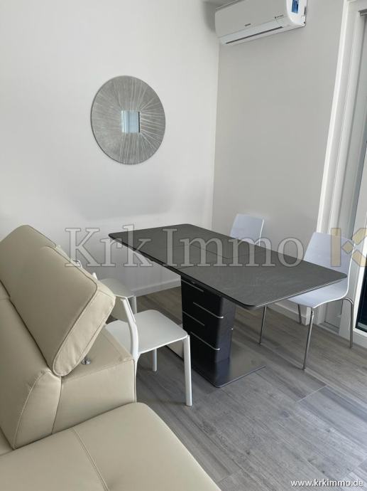 Na prodaju je novi luksuzni apartman na prvom katu stambene zgrade smještene u gradu Krku, na izvrsnoj lokaciji samo 300 m od mora. Apartman ima ukupnu stambenu površinu od 98 m2, a sastoji se od hodnika, tri spavaće sobe, svaka s vlastitom kupaonicom, WC-a te kuhinje s blagovaonicom i dnevnim boravkom. Kuhinja i dnevni boravak ujedno imaju izlaz na natkrivenu terasu površine 16 m2.