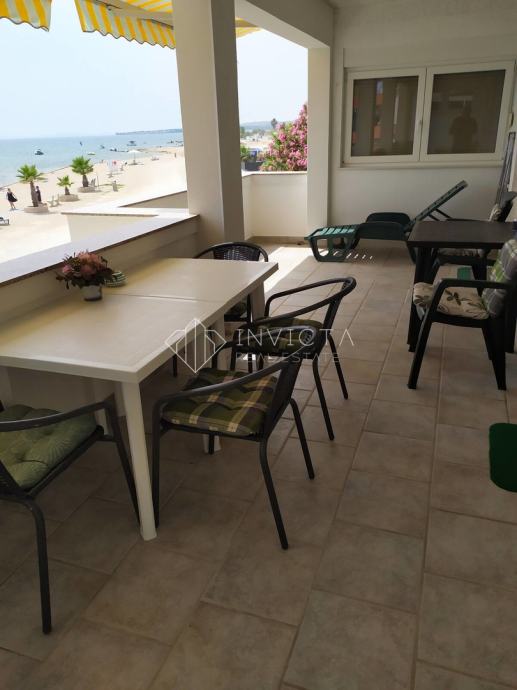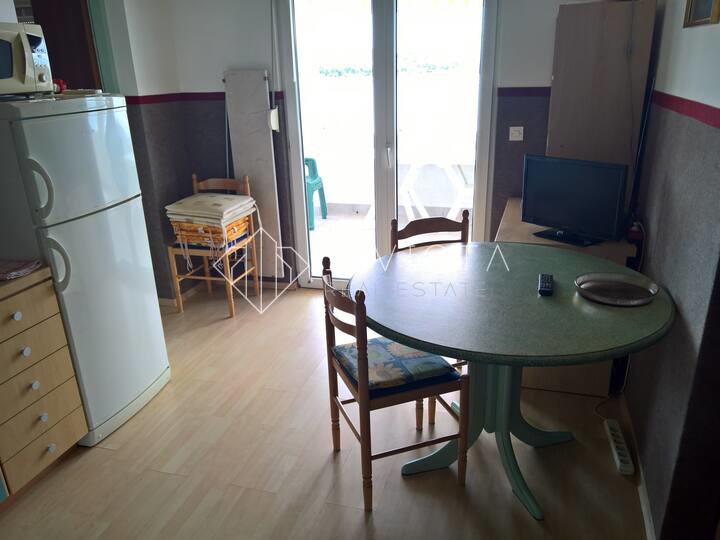 Dodatne pogodnosti uključuju terasu i dostupno parkiralište, što doprinosi ukupnoj praktičnosti i udobnosti života. Stan je smješten u prvom redu do mora, što ga čini savršenim izborom za ljubitelje prirode i onih koji žele uživati u okruženju uz more.