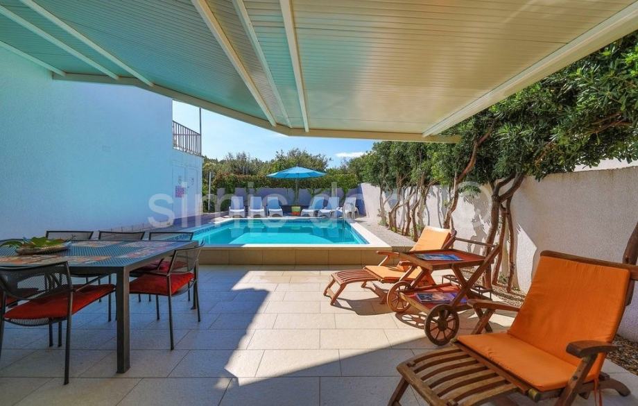 Posredujemo u prodaji vrlo šarmantne, odlično održavane i prostrane kuće na iznimno mirnoj lokaciji na otoku Čiovu. Bruto je površina kuće 242m2, a nalazi se na parceli od 509m2. Kuća se proteže na tri etaže: podrum, prizemlje i prvi kat. U podrumu je smještena vrlo velika ostava i gustirna. Prvi je dio kuće osmišljen kao jedna stambena jedinica koja u prizemlju ima spavaću sobu, kupaonicu te lijep dnevni boravak s kuhinjom, a iz tog se dijela izlazi na prekrasan dvor s velikim bazenom i sunčalištem. Prvi kat ovog dijela kuće još nudi i dvije spavaće sobe s jednom kupaonicom. U drugom su dijelu kuće dva apartmana (jedan u prizemlju, drugi na prvom katu), a svaki od tih apartmana ima dvije spavaće sobe, kupaonice te odlično uređene dnevne boravke s kuhinjama. Ova razina kuće nudi i vrlo šarmantan pogled na more i okolne otoke. Kuća je okružena popločanom, pažljivo održavanom okućnicom, a dodatna je prednost prekrasan vrt s mnoštvom mediteranskog raslinja. Kuća je vrlo kvalitetno opremljena i namještena, a s obzirom na niz mogućnosti u smislu odvojenih stambenih jedinica, jako je dobar izbor za vaš odmor, ali i za moguće iznajmljivanje. Vlasništvo uredno.
