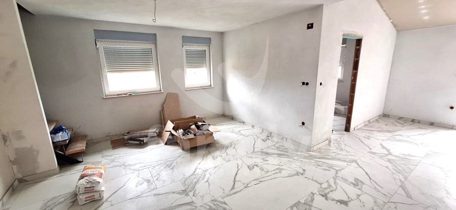 Drugi stan na drugome katu stan je površine 92,51 m2 i nenamješten je. Unutar njega nalaze se dnevni boravak, kuhinja, prostor za ručavanje sa kojeg se izlazi na terasu, a sa koje se pruža predivan pogled na Brijunsko otočje, kupaonica i dvije spavaće sobe. Stepenicama od hrastovog drveta dolazi se do galerije u kojoj se nalazi još jedna spavaća soba i kupaonica. Sistem grijanja i hlađenja je putem četiri jedinice klima uređaja (svaka spavaća soba sa svojom klimom i jedna jedinica se nalazi u dnevnom boravku). Postavljena je PVC stolarija dvoslojnog stakla sa 7 plinskih komora sa ALU roletama i dodatnom izolacijom, kao i keramika. Zgrada je izgrađena visokokvalitetno i posjeduje termofasadu 8 cm. Okućnica je dovoljne površine da zadovolji velik broj parkirnih mjesta, a na njoj se nalaze i postavljena drvena spremišta za svaki stan po jedno.