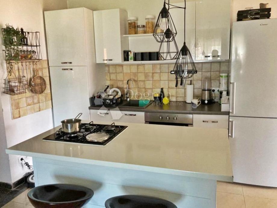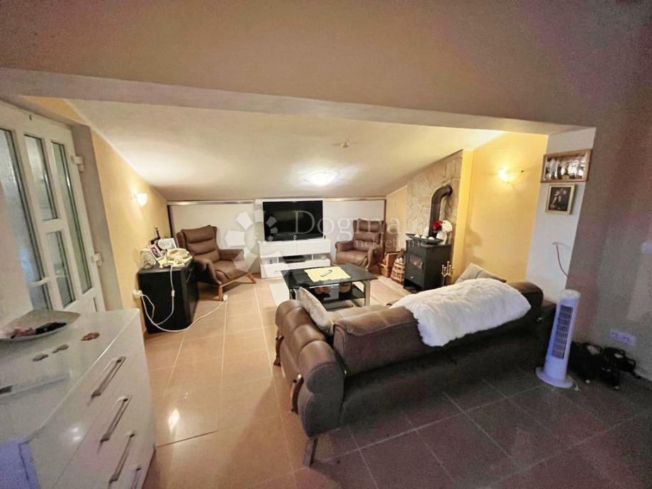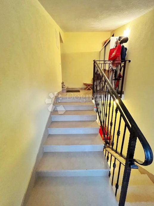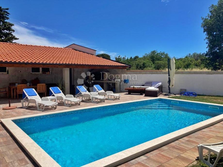 Kuća je kompletno opremljena, namještena, klimatizirana te osigurana. Također, ima veliko popločano dvorište sa betonskim bazenom (32m2, 8x4), vanjsku natkrivenu konobu i kuhinju, kamin, te garažu sa sanitarnim čvorom (tuš, wc).