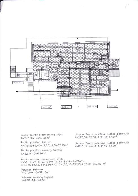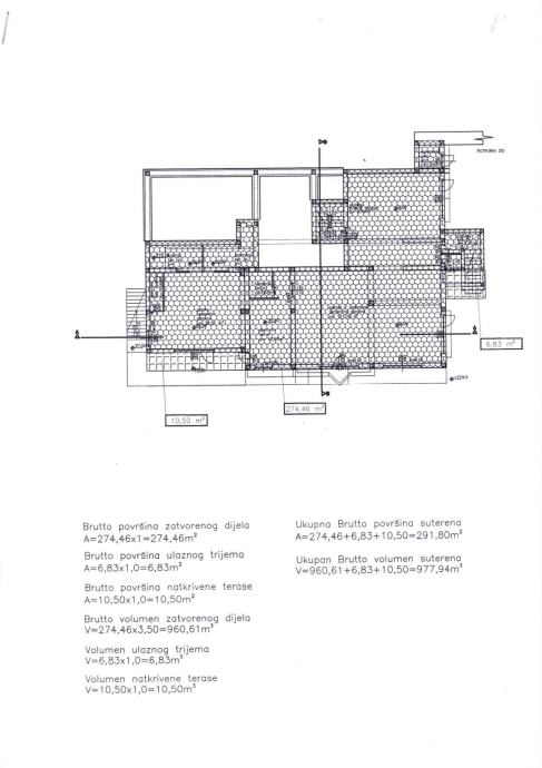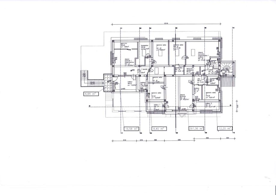 1.kat - sastoji se od dva dvosobna stana, jedan 100 m2 sa balkonom i 150 m2 sa terasom od 50 m2, te jedan jednosoban stan od 45 m2