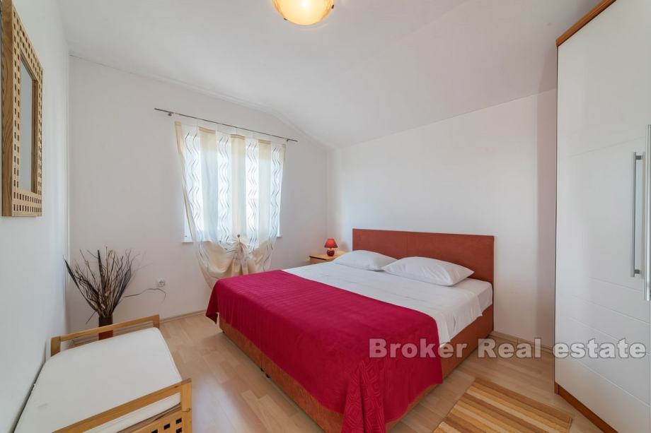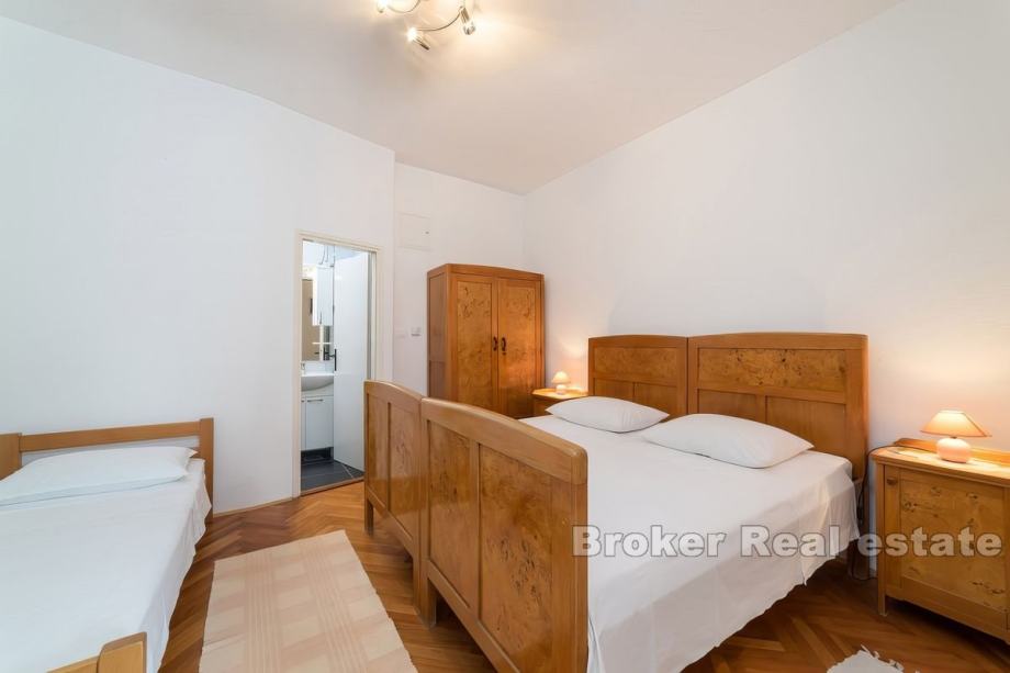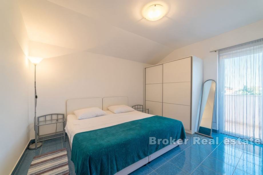 Prvi kat čini jednu cjelinu, odnosno veliki četverosobni stan s tri kupaonice, kuhinje, tri balkona i prostranom terasom površine od 50m2. Ovaj stan nudi pogled na more i vrt. Na drugom katu se nalaze dva jednosobna stana, također s balkonom i pogledom na more i vrt.