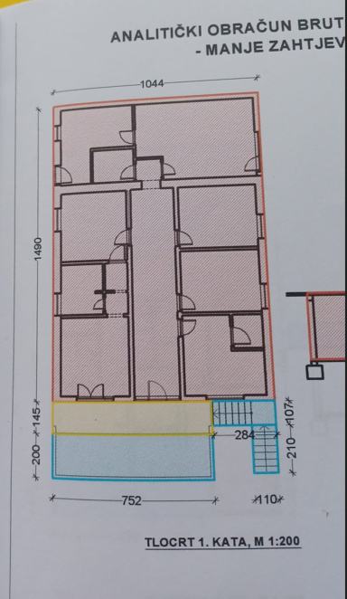 Kuća je kaskadno građena, smještena na tri etaže na izvanrednoj lokaciji. Sastoji od prizemlja I dva kata.U prizemlju se nalaze dva apartmana koja imaju izlaz na prostranu terasu s vrtom.Ispred se nalazi pomoćna prostorija površine 32 m2 na čijoj terasi se može napraviti bazen. Na prvom katu su 2 veća apartmana svaki s izlazom na balkon s pogledom na more. Na drugom katu su novouređena dva apartmana s balkonom. Kuća je u funkciji turizma udaljena od plaže 2 minute hoda. Kuća ima 4 parkirna mjesta.