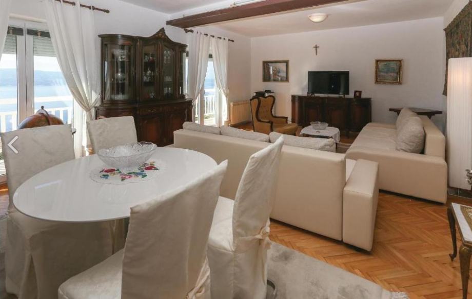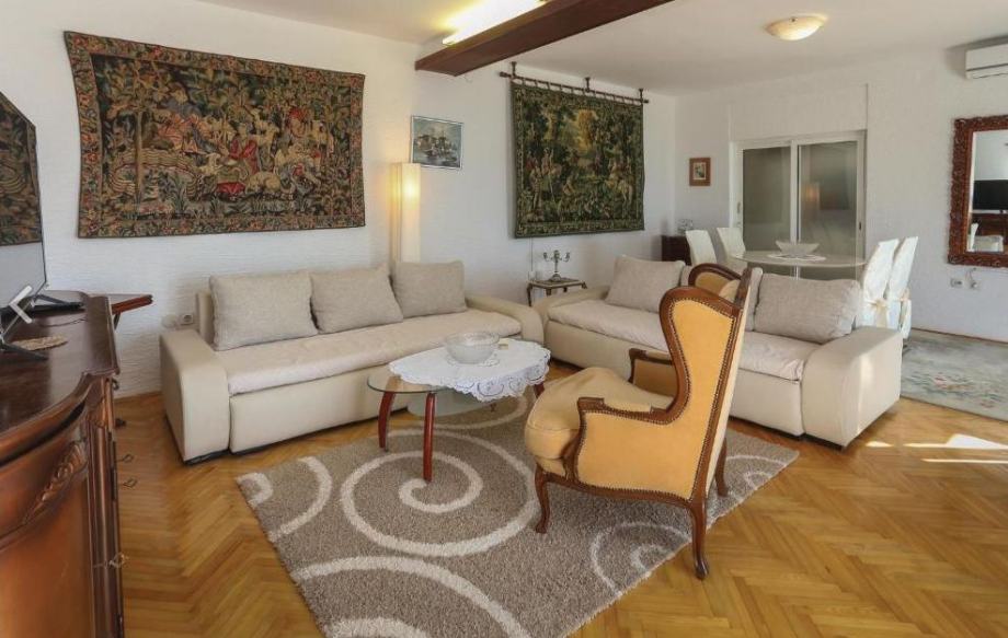 The house has easy access by car, not far from the main road. It consists of a ground, first, second, and third floor. The ground floor has an open living area with additional two kitchens, storage-room, and bathroom. The first floor is a five bedroom apartment with two bathrooms. The apartment also has a large terrace approx 70m2. The second and third floor are large two bedroom apartments with dining and living areas, balconies, terraces and bathrooms. Garage parking for 2 cars, and parking place above the garage for another six cars. The house has solar and central heating, a beautiful open view of the sea. Documentation is in order.