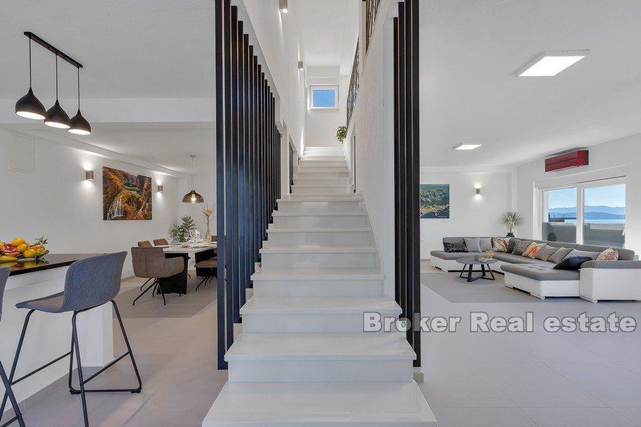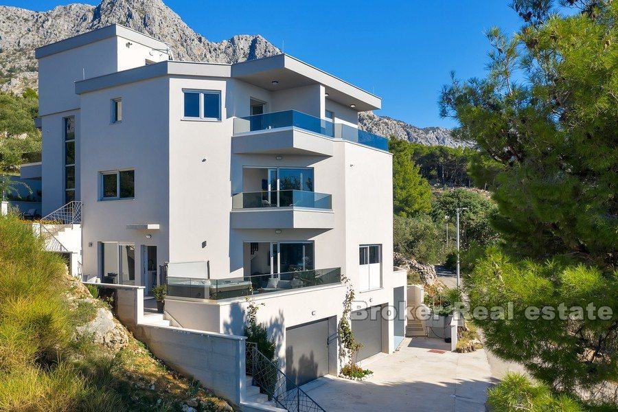Novoizgrađena, samostojeća apartmanska kuća s pogledom na more. Smještena je na mirnoj lokaciji, u malom turistički atraktivnom mjestu koje se smjestilo u podnožju planine Biokovo, u blizini Makarske. Kuća se sastoji od četiri etaže.
