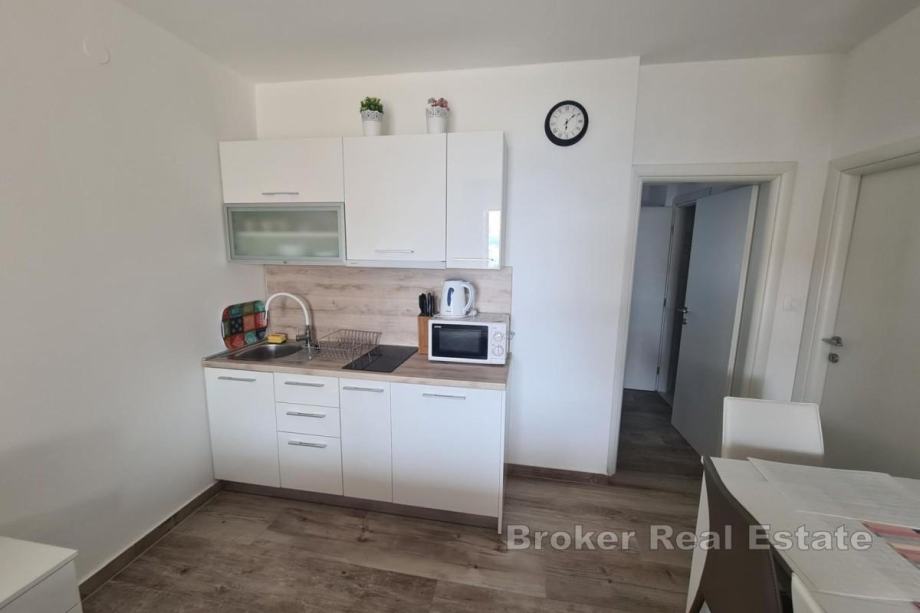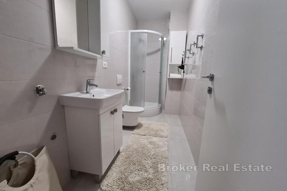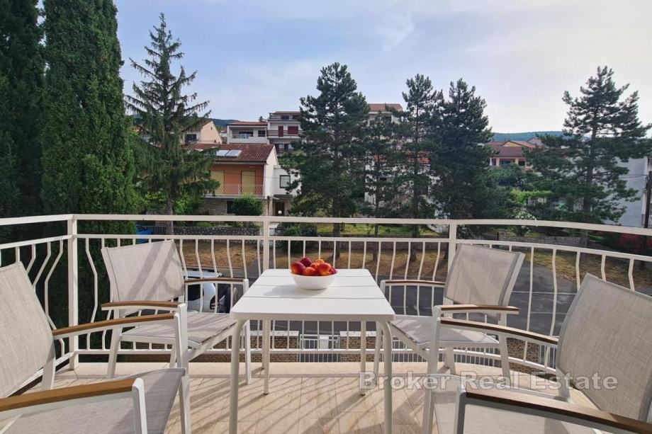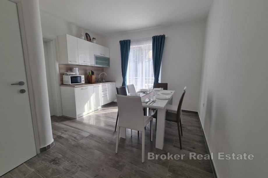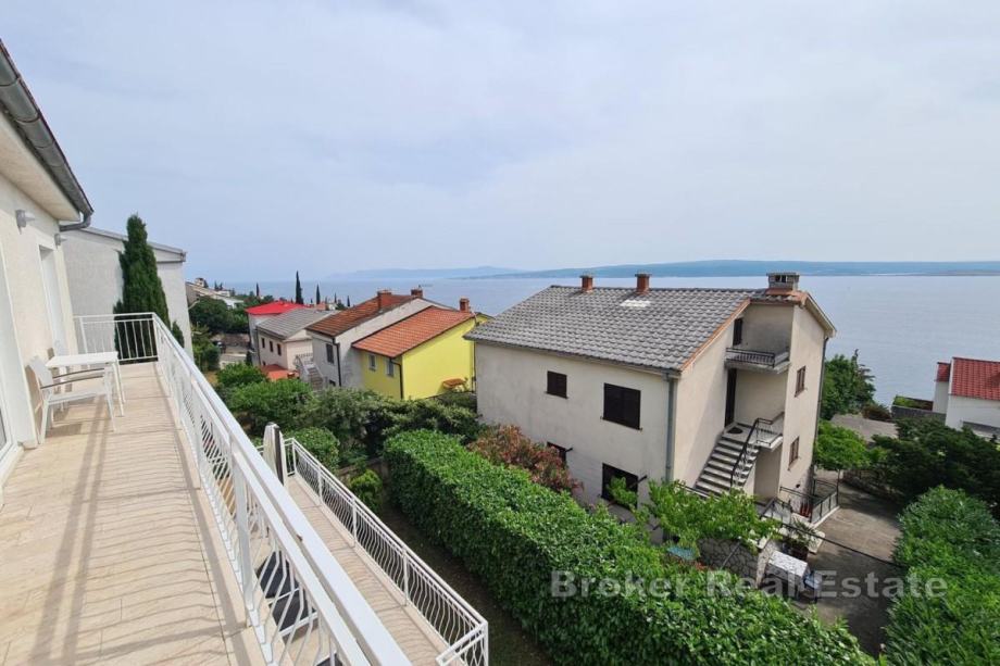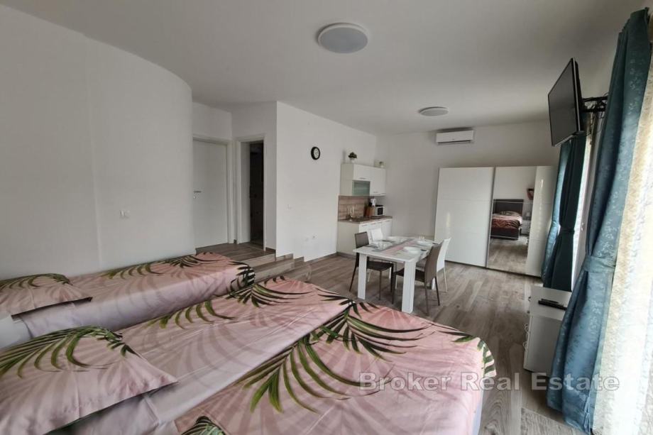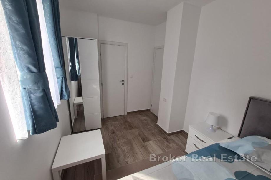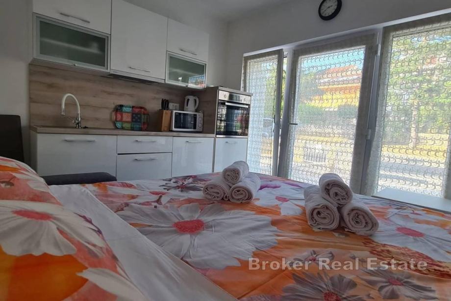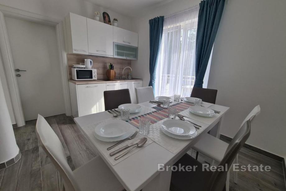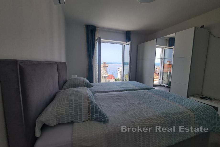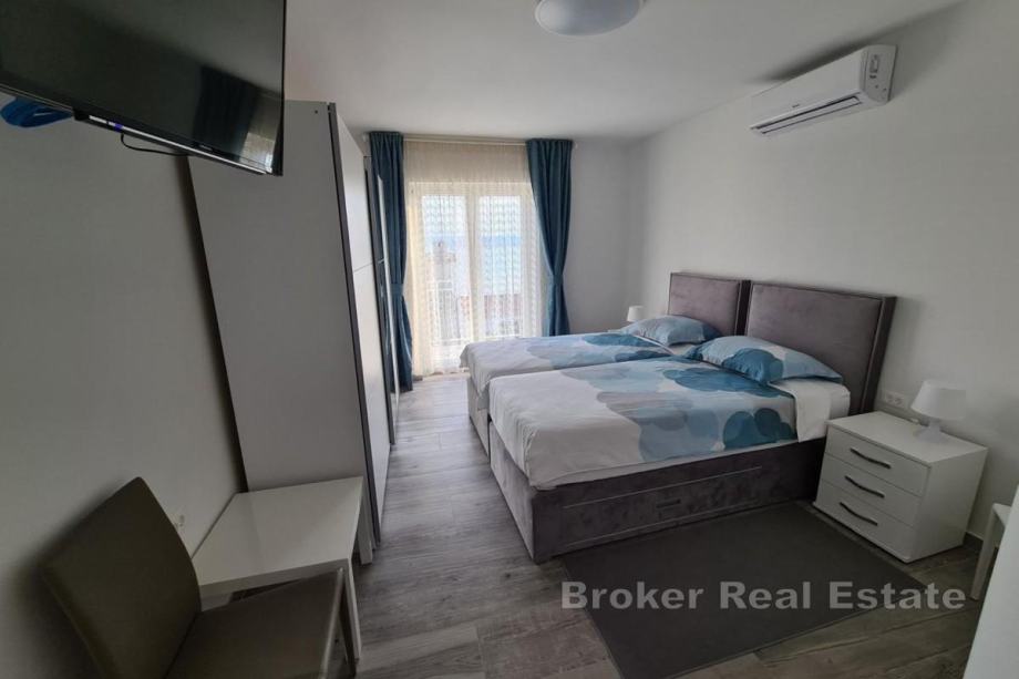 Raspored: U suterenu se nalazi 2S stan s hodnikom, kupaonicom, dnevnim boravkom, kuhinja i blagovaona s izlazom na veliku terasu. U prizemlju se nalaze dva studio apartman s terasama. Na prvom katu se nalazi veliki apartman: hodnik, dvije kupaonice, četiri spavaće sobe, kuhinja i blagovaonica, dnevni boravak s izlazom na veliku terasu s prekrasnim pogledom na more. Stan je moguće podijeliti u dvije stambene cjeline.