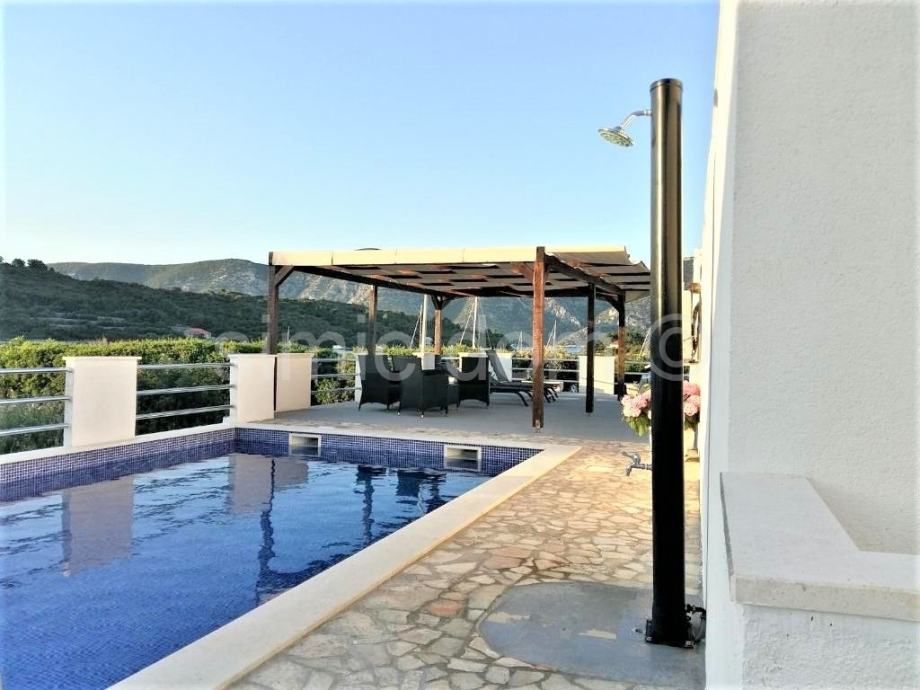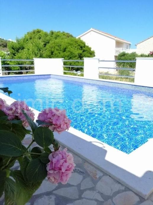 Posredujemo u prodaji vrlo prostrane kuće s 4 stana na iznimno atraktivnoj lokaciji u prvom redu do kristalnog mora mirne uvale otoka Korčule. Površina kuće je oko 290m2, a nalazi se na parceli od 900m2, omogućujući time prekrasnu, veliku okućnicu s održavanim vrtom prepunim mediteranskog raslinja. Kuća se prostire na dvije etaže: prizemlje i prvi kat. U prizemlju se nalazi stan od 120m2 koji ima hodnik, kuhinju, blagovaonski prostor, dvije spavaće sobe, dvije kupaonice i odličnu terasu s bazenom (30m2 površina bazena) koji nudi spektakularan pogled na more i okolno područje. U prizemnoj se etaži smjestio i još jedan stan s jednom spavaćom sobom, hodnikom, kuhinjom, blagovaonicom i kupaonicom. Na katu su, pak, dva stana od kojih svaki ima dvije spavaće sobe, kuhinju, kupaonicu i blagovaonski prostor. Ova dva stana dijele terasu koja također ima prelijep pogled na more. Potkrovlje je trenutno neuređeno i idealno je za opremanje u još jedan stan. Kuća ima i veliku garažu. Budući da se prodaje potpuno opremljena i namještena, kuća je odličan izbor za posao iznajmljivanja, dok njezina fantastična, mirna lokacija u prvom redu do mora jamči mir odlučite li se za ovu kuću kao obiteljsku destinaciju. Vlasništvo uredno.