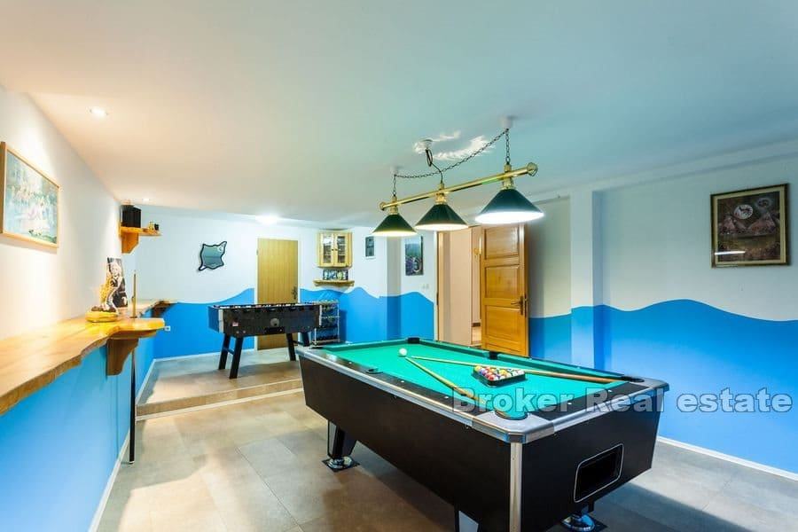 s blagovaonicom i dnevnim boravkom i omogućenim izlazom na natkrivenu terasu. Ima i prostoriju koja je opremljena zabavnim sadržajem kao što su biljar, stolni nogomet i pikado.