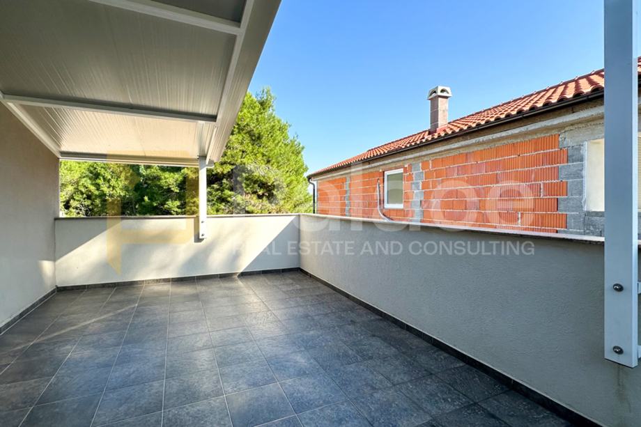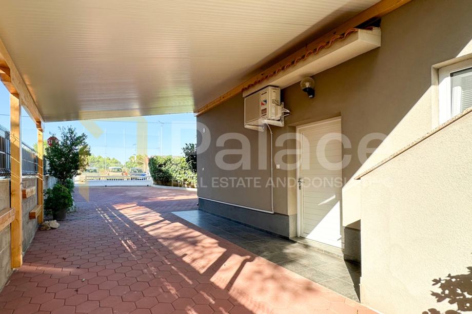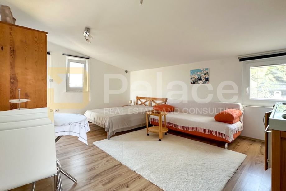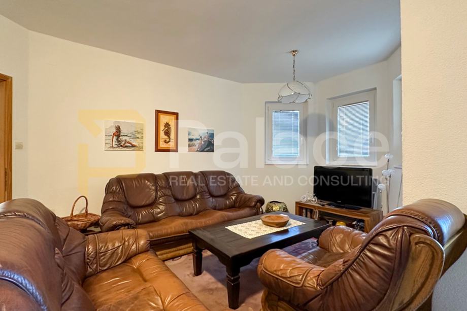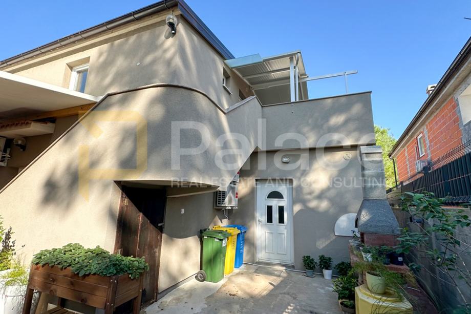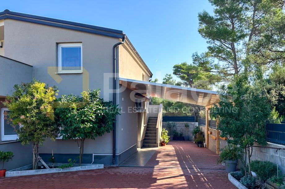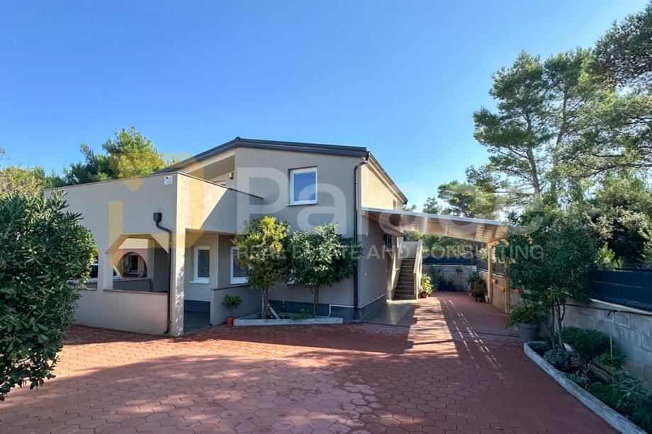 Kuća je dizajnirana za ugodan i funkcionalan život, a nudi i mogućnost višestrukog iznajmljivanja. U prizemlju se prostire prostrani stan koji zauzima cijelu etažu, sastoji se od kuhinje s blagovaonicom, prostranog dnevnog boravka, tri spavaće sobe, kupaonice, dodatnog wc-a te pvc prozorima zatvorene terase površine 30 m² koja idealno služi za uživanje u vanjskom prostoru. Na prvom katu kuće smještena su dva manja, potpuno opremljena apartmana, svaki s vlastitom kuhinjom, blagovaonicom, spavaćom sobom, kupaonicom i natkrivenom terasom od 30 m², s kojih se pruža ugodan pogled na okolicu.