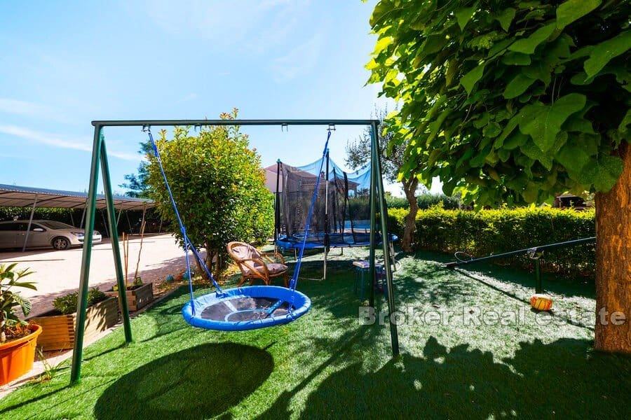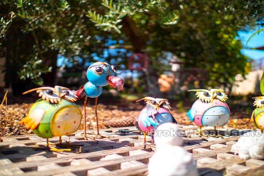 Vrt je bogat hortikulturom gdje se brižno vodilo računa o svakom detalju. Na njemu se nalazi noću osvijetljeni bazen od 40m2 sa svojim sunčalištem, vanjski tuš, prostor za igru i razonodu najmlađih posjetitelja, veliki natkriveni parking i velika ljetna kuhinja s roštiljem odnosno velikim prostorom za obiteljska druženje i blagovanja.