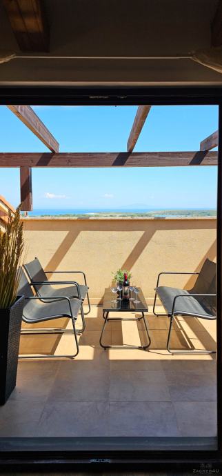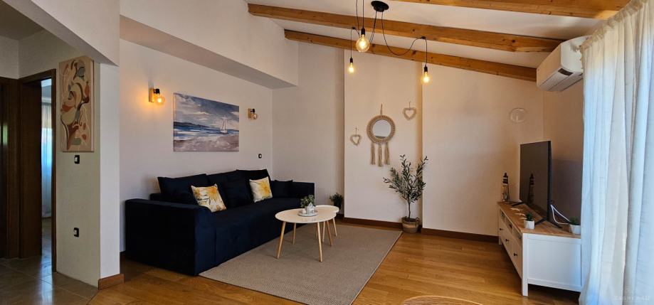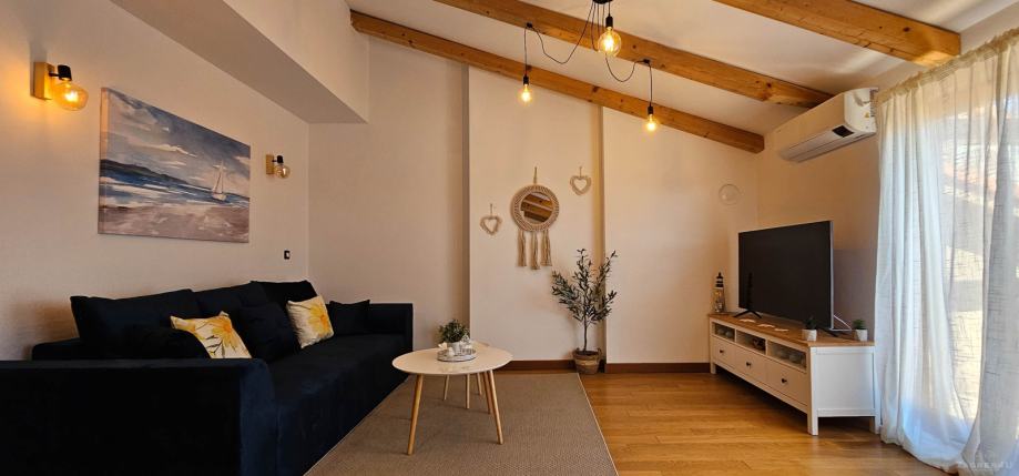 Prostrani apartman s terasom i pogledom na more ima 2 spavaće sobe, dnevni boravak, ravni TV, opremljenu kuhinju s perilicom posuđa i pećnicom te 1 kupaonicu.