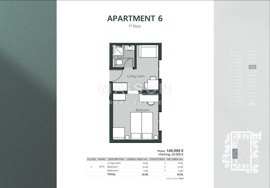 Smješten na 1. katu ekskluzivnog kompleksa Crikvenica Residence, APP 6 površine 21,63 m² spaja elegantni dizajn, funkcionalnost i visoku investicijsku vrijednost.