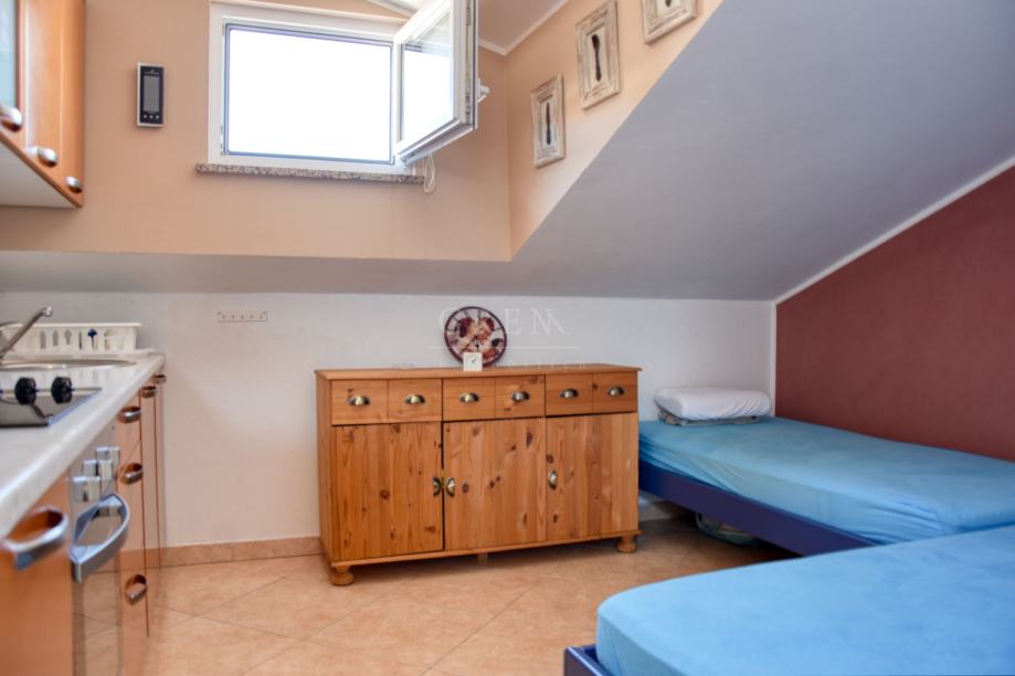 Izvrsna prilika , prodaje se ovaj app udaljen od mora samo 1000 m i od centra Poreča cca.1500 m. Apartman se nalazi u visokom potkrovlju i sastoji se od : Kupatila , spavače sobe , blagovaone , kuhinje i dnevnog boravka neto veličine 54,5 m2. Stanu pripada podrum od 3,75 m2 i parkirno mjesto ispred zgrade. Apartman se prodaje namješten i sa svim aparatima .