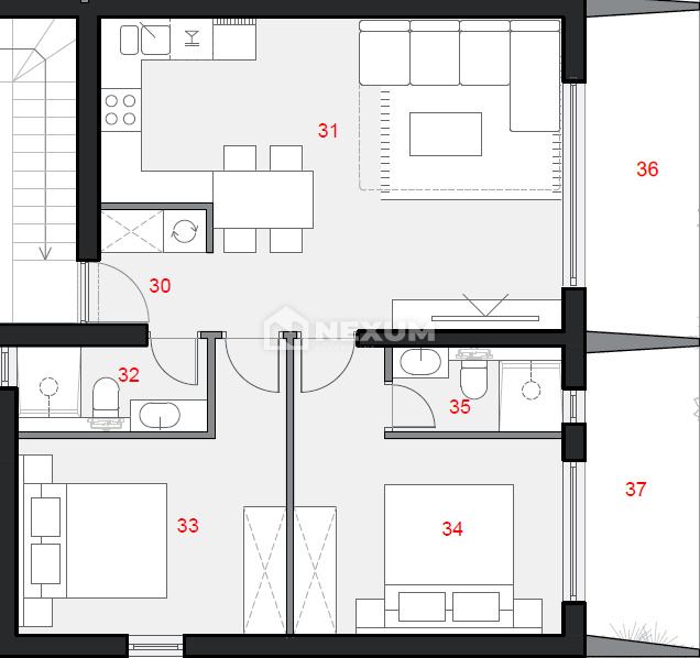 Posredujemo u prodaji dvosobnog stana na drugom katu novogradnje. Ukupna stambena površina iznosi 72,16 m², a sastoji se od dvije spavaće sobe, dvije kupaonice, hodnika, dnevnog boravka s kuhinjom i blagovaonicom te dvije lođe. Jedna od spavaćih soba ima vlastitu kupaonicu i direktan izlaz na lođu.