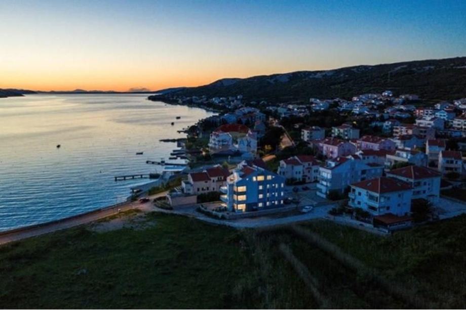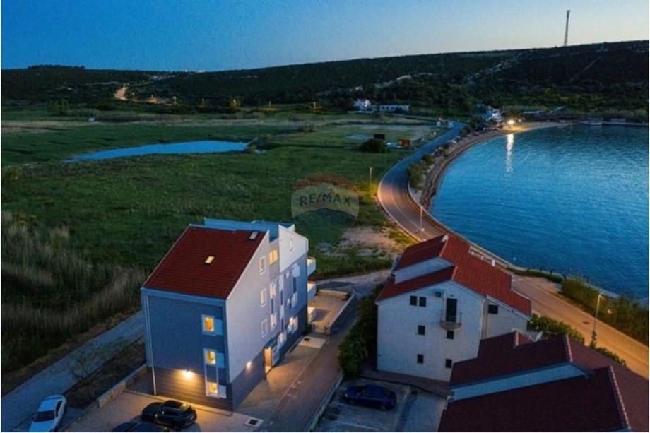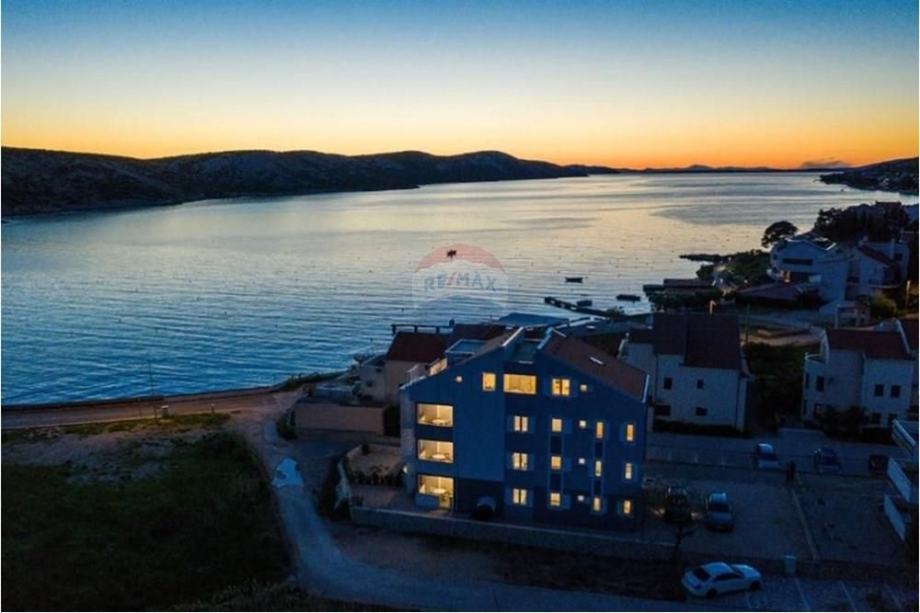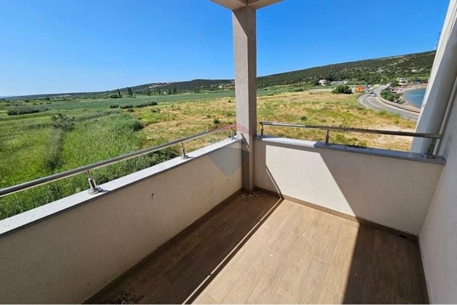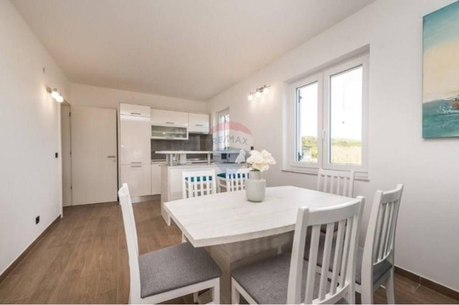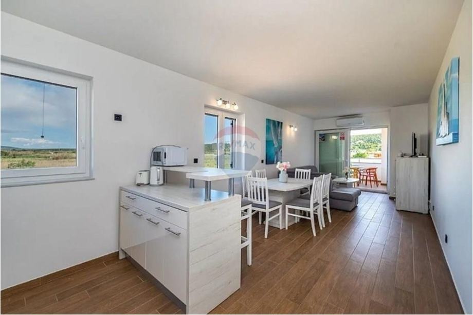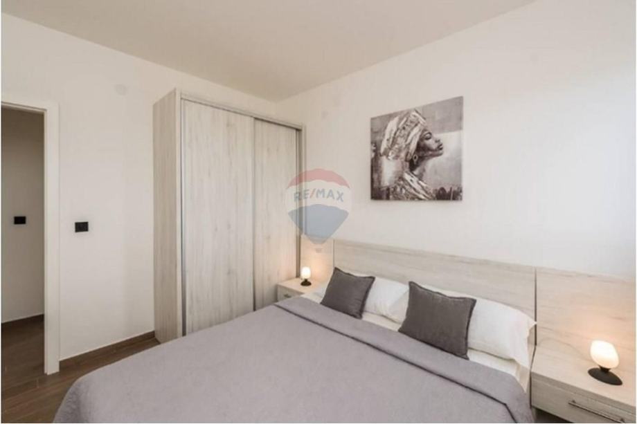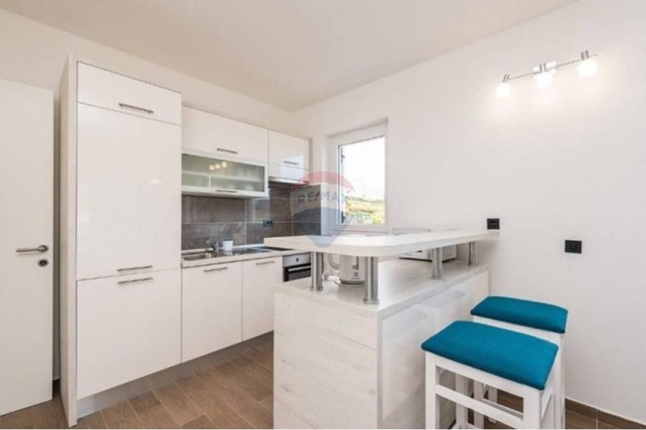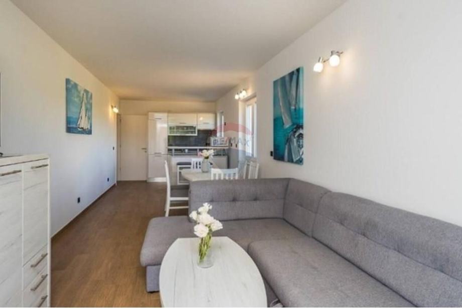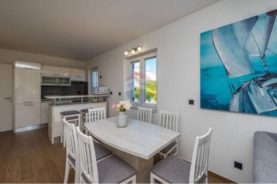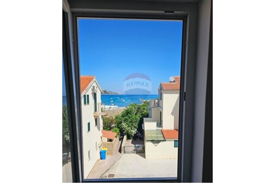 Unutrašnjost ovog moderno namještenog stana obuhvaća dvije prostrane spavaće sobe, moderno uređenu kupaonicu, te otvoreni koncept kuhinje s blagovaonicom. Iz dnevnog dijela pruža se prekrasan, otvoren pogled na more i zaljev, čime se osigurava opuštajuća atmosfera i uživanje u mediteranskoj klimi.