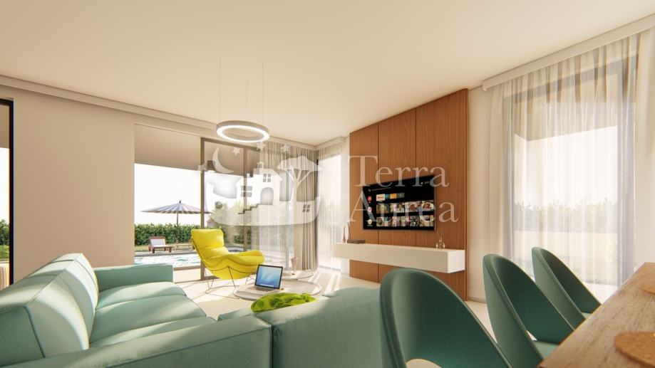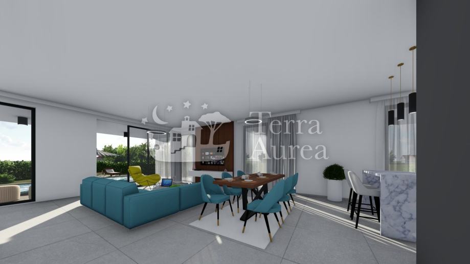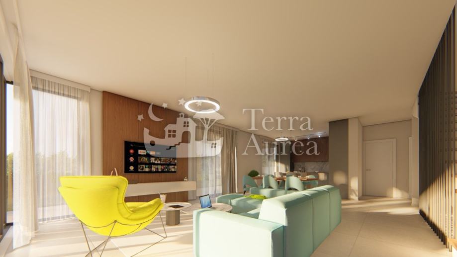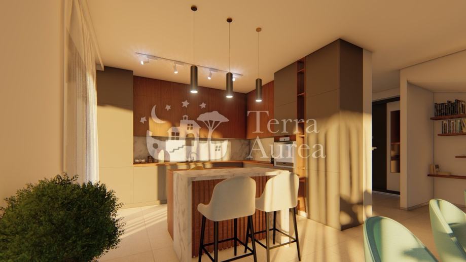 Prizemlje obuhvaća prostrani dnevni boravak koji odiše svijetlošću, kuhinju s blagovaonicom, wc, praonicu te ima izlaz na terasu na kojoj svakodnevno možete uživati u zrakama sunca.