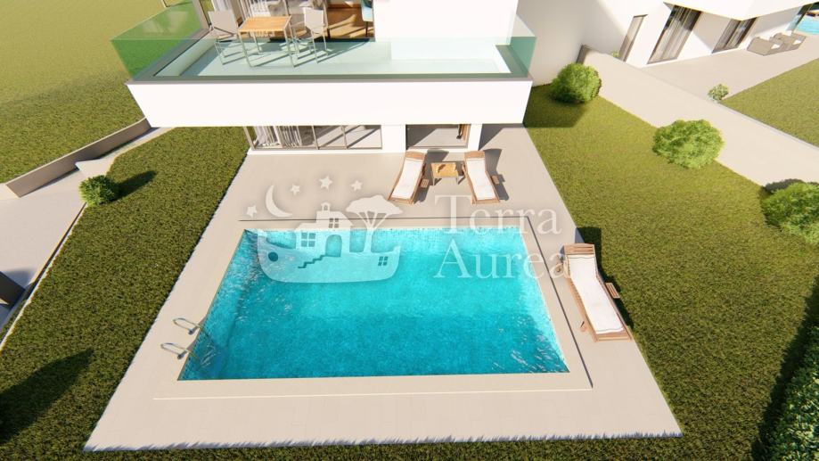 Područje bazena i natkrivena terasa dominiraju vanjskim dijelom nekretnine, gdje se noću stvara posebna atmosfera. Terasa bazena opremljena je ležaljkama za sunčanje. Upravo ovaj segment nekretnine je nerijetko najdraži, čemu doprinosi doza intime i svojevrsne izolacije jer se ondje možete u potpunosti opustiti.