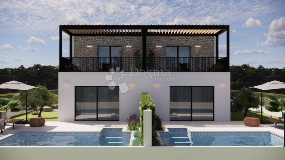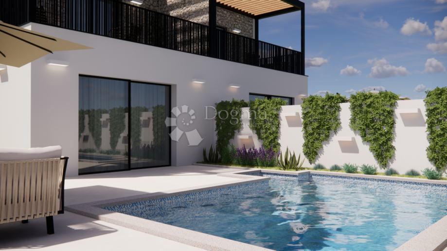 Kuća je raspoređena na dvije etaže. U prizemlju se nalazi prostrani dnevni boravak s kuhinjom i blagovaonicom otvorenog tipa, stvarajući povezan i svijetao prostor za svakodnevni život. Na ovoj etaži nalazi se i jedna spavaća soba s vlastitom kupaonicom, što je idealno rješenje za goste ili članove obitelji kojima je potrebna soba u prizemlju. Također, u prizemlju se nalaze praonica, spremište te dodatni WC za goste. Iz dnevnog boravka izlazi se na uređenu okućnicu s bazenom, sunčalištem i prostorom za opuštanje.