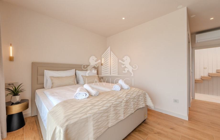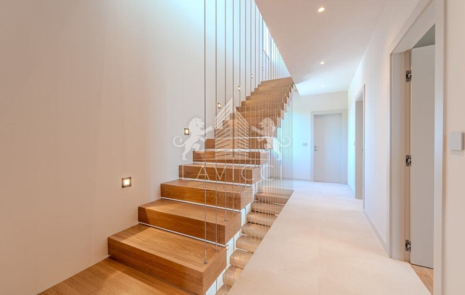 Unutarnje stubiše decentnog i otmjenog izgleda vodi na kat na kojem su smješteni vešeraj, 3 spavaće sobe s en-suite kupaonicama s toaletom i izlazima na natkriveni balkon.