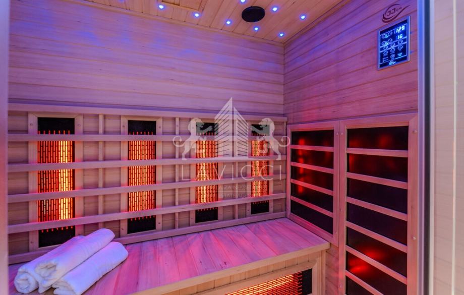 Na drugom katu nalazi se toalet, a hodnik vodi u lounge prostoriju iz koje se ulazi u prostor za potpuno uživanje i odmor koji se sastoji od infracrvene saune, hidromasažne kade (jacuzzi), tuš kabine i izlaza na krovnu terasu / sunčalište s kojeg se pruža predivan pogled na more.