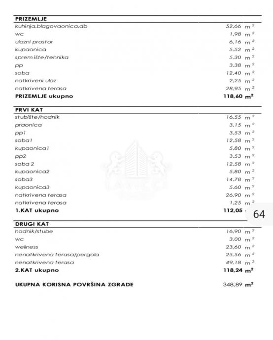 Vila ukupne stambene površine 349 m2 smještena je na zemljištu površine 591 m2, udaljena od mora i plaže svega 250 m.