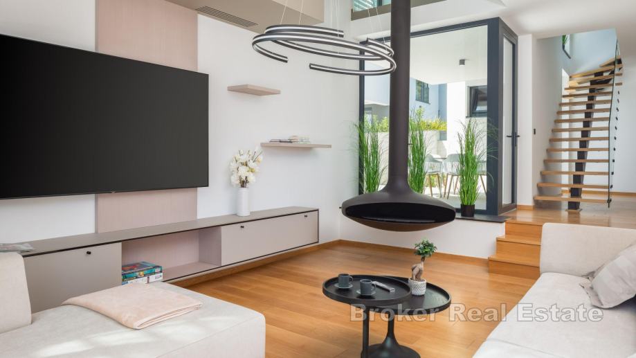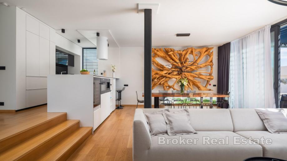 kuhinje, blagovaonice i dnevnog boravka sa izlazom na uređenu okućnicu. Na prvom katu je smještena praonica, tri spavaće sobe sa izlazom na natkrivene terase, dvije kupaonice i dva garderobna prostora. Na drugom katu je smješten wc, kupaonica, garderoba i jedna spavaća soba iz koje se pruža pogled na more.