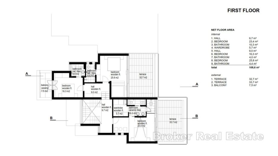Na prvoj etaži ukupne stambene površine 194 m2 nalazi se toalet, spavaća soba s kupaonicom, kuhinja s blagovaonicom te prostrani dnevni boravak s izlazom na terasu s koje se pruža veličanstveni otvoreni pogled na more.