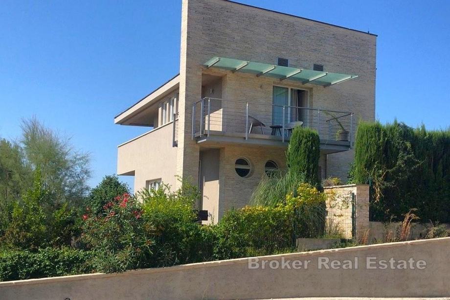 – Na I etaži zasebnog ulaza, koja je ujedno centralna etaža nalazi se ulazni dio, veliki dnevni prostor otvorenog koncepta s kuhinjom i blagovaonicom, dva balkona. Ova etaža spojena je s velikom kamenom popločanom okućnice gdje se nalazi bazen, sunčalište., vanjski kamin i ljetna kuhinja.