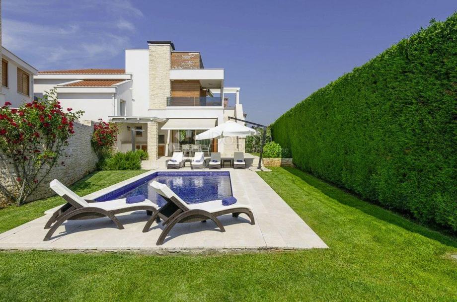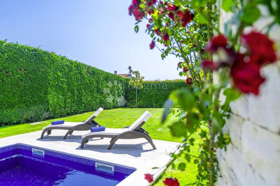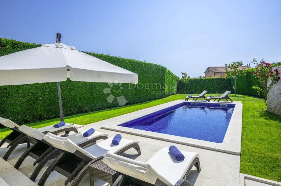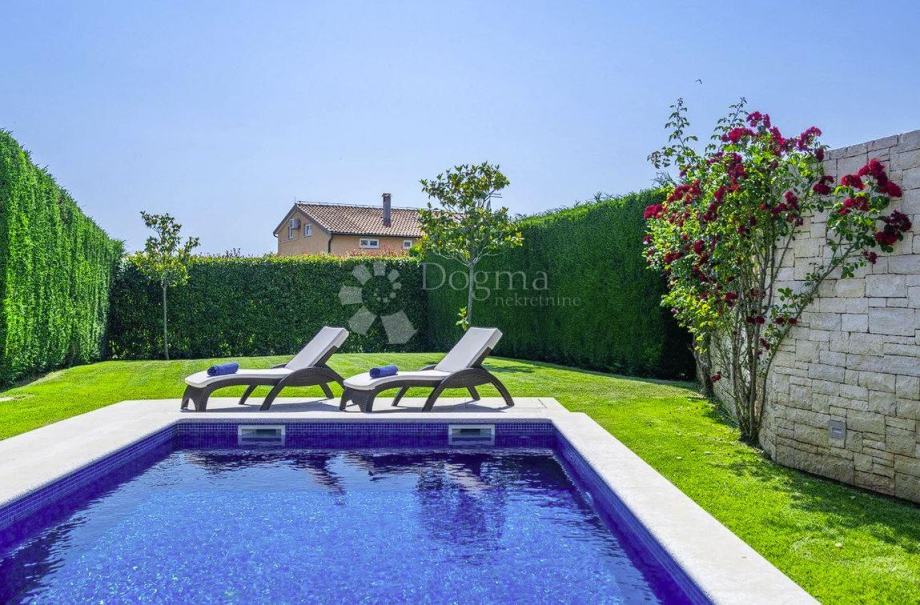Ova atraktivna i moderna vila površine 160 m² smještena je na privatnom i ograđenom zemljištu od 683 m², pružajući idealan ambijent za uživanje u miru i luksuzu. Vila se može pohvaliti njegovanom travnjaku, privatnim bazenom od 35 m², te natkrivenom terasom s ljetnom kuhinjom i prostorom za sjedenje, savršenom za opuštanje i obroke na otvorenom. Dodatni sadržaji uključuju otvoreni parking za jedno vozilo i mjesto u garaži.