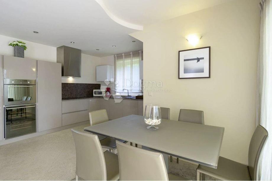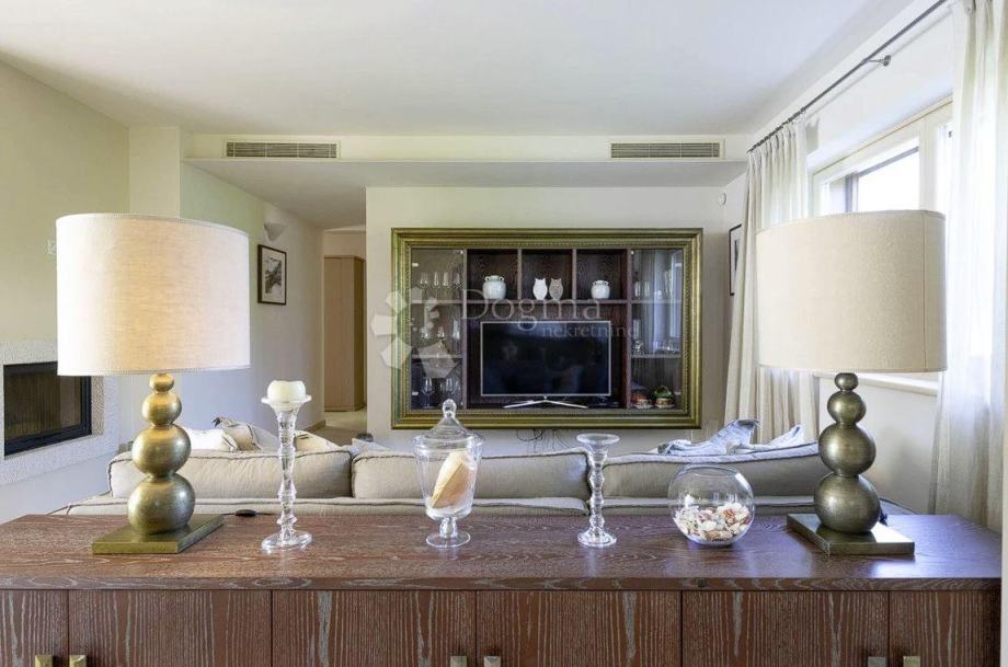 Na prvom katu nalazi se prostrani dnevni boravak s potpuno opremljenom kuhinjom, blagovaonicom i udobnim prostorom za sjedenje s kaminom, koji se otvara prema vrtu i bazenu. Ovaj otvoreni koncept stvara savršeno okruženje za druženja i obiteljska okupljanja.