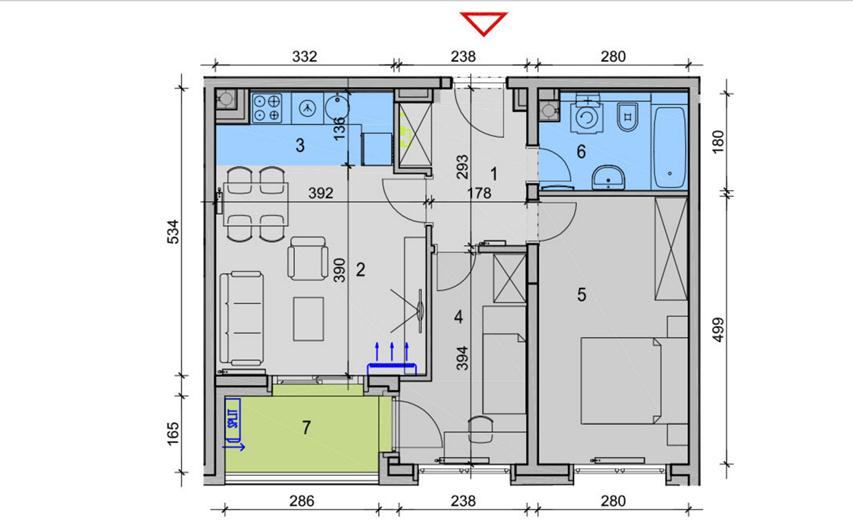 Prodaje se stan u objektu u izgradnji po cijeni od: 1.790 €/m², a sastoji se od: dvije sobe, dnenvnog boravka s blagovaonicom, kuhinje, ulaznog prostora i balkonića. Stan je orijentiran na istok.