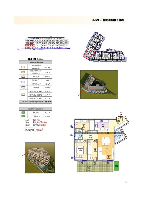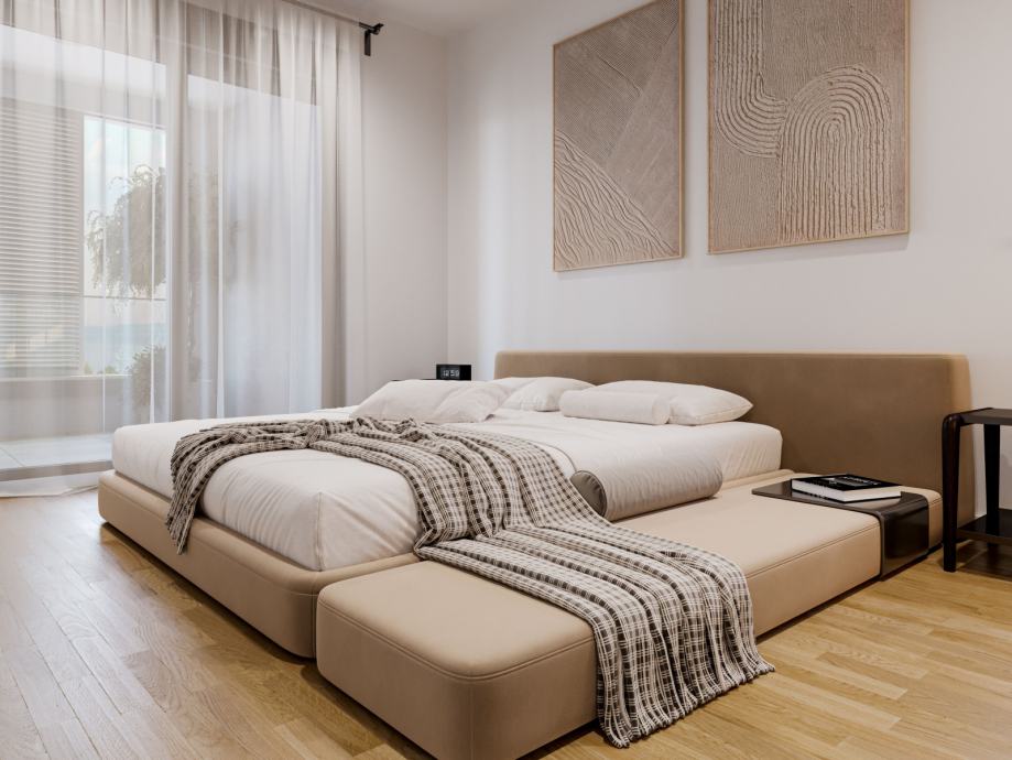 Stan AS 9 - Stan ukupne stambene površine 88,76 m², s balkonom od 18,6 m², pruža savršen spoj udobnosti i elegancije. Smješten na prvom katu, južne orijentacije, ispunjen je prirodnim svjetlom tijekom cijelog dana. Otvoreni dnevni prostor s kuhinjom i blagovaonicom izlazi na veliki balkon s prekrasnim pogledom na more. Dvije spavaće sobe su južne orijentacije te također imaju direktan izlaz na balkon. Treća spavaća soba je na zapadu. Dvije kupaonice s tušem i wc-om, garderoba, hodnik i obilje prostora za odlaganje čine ovaj stan idealnim domom za bezbrižan život uz more.