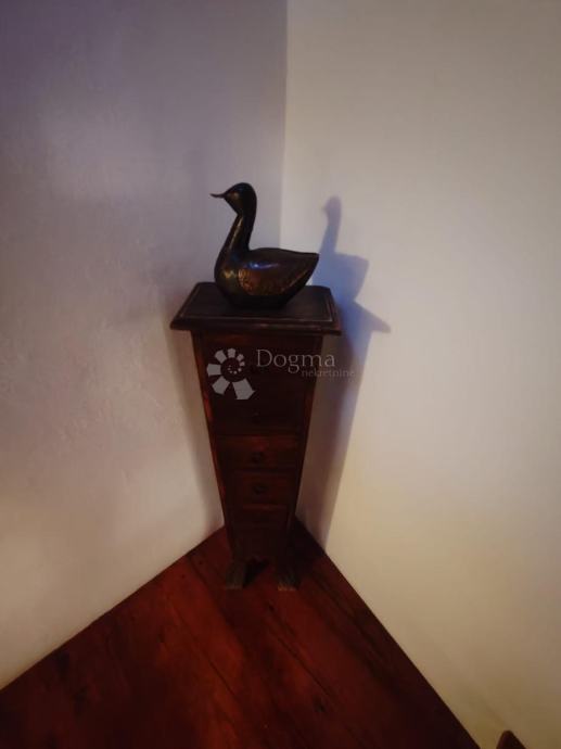 Na prvom katu nalazi se kupaonica, šarmantno uređen dnevni boravak i prostrana spavaća soba, a klimatizacija koja osigurava maksimalnu udobnost.