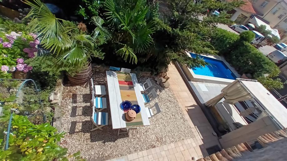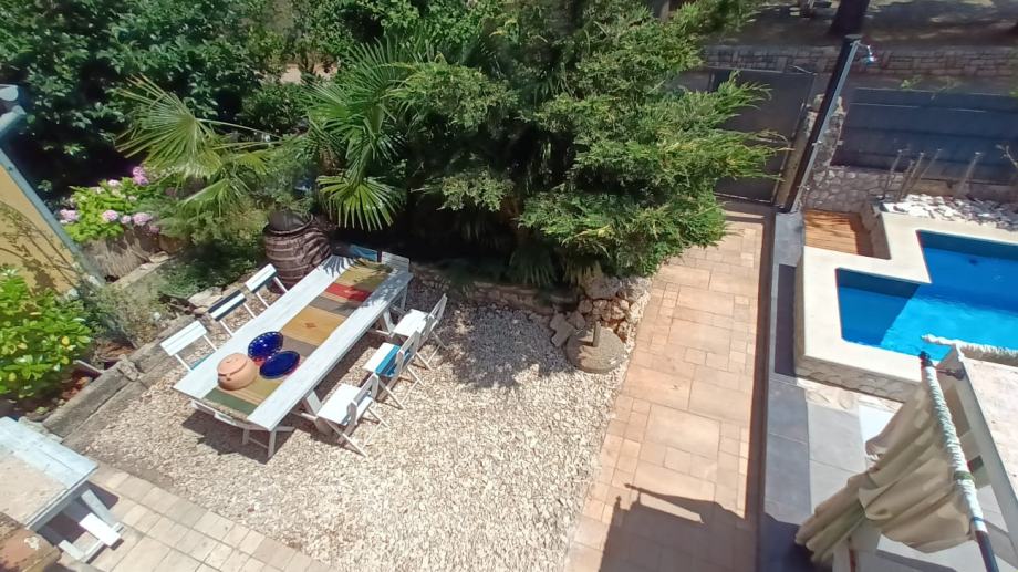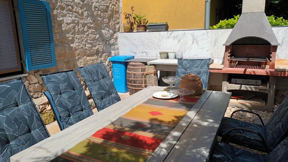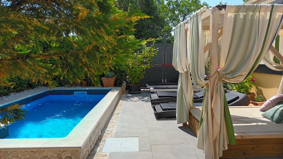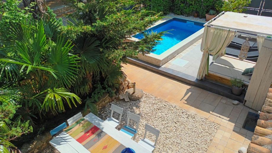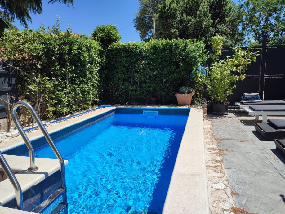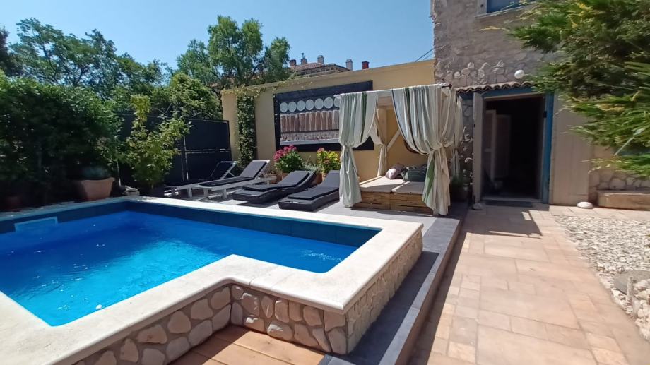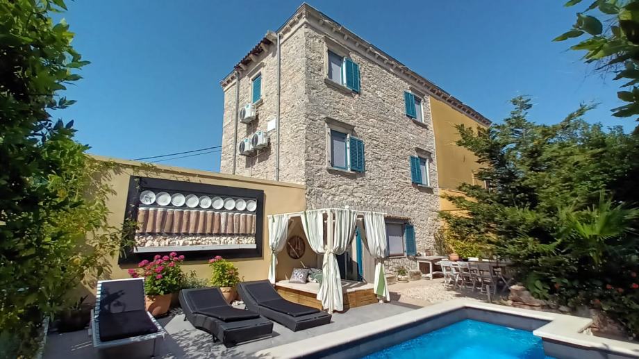 Izvan kuće, 100 m² uređene okućnice pruža dovoljno prostora za uživanje na svježem zraku, dok privatni bazen dodatno upotpunjuje osjećaj luksuza i opuštenog načina života. Ovdje možete provesti duge ljetne dane u hladu kamene terase ili osvježenju bazena, dok uživate u miru i tišini koje ovo mjesto nudi.