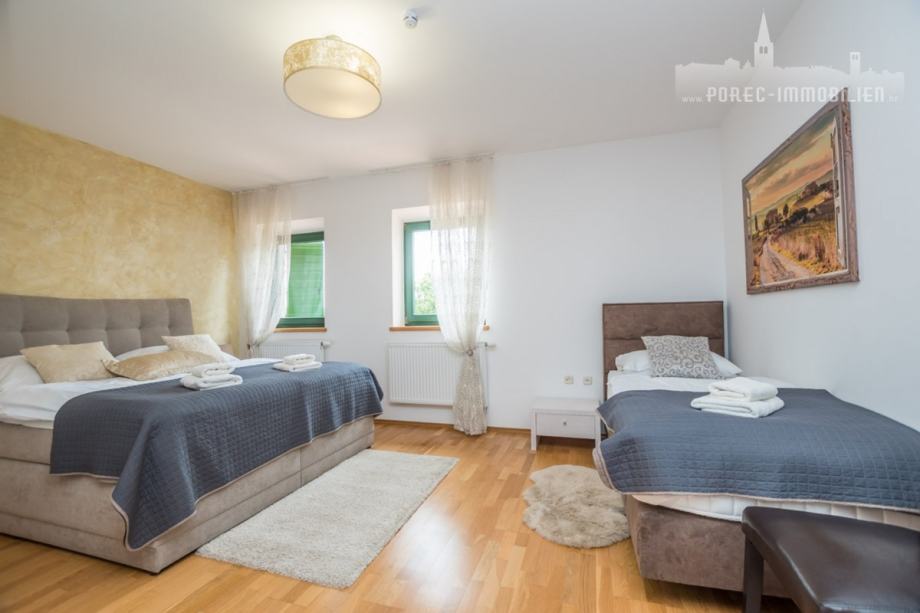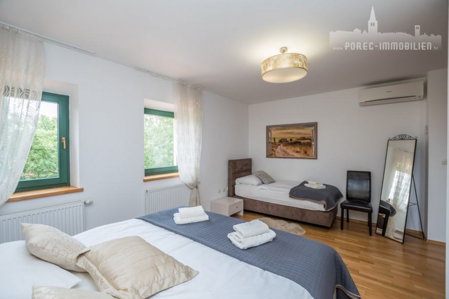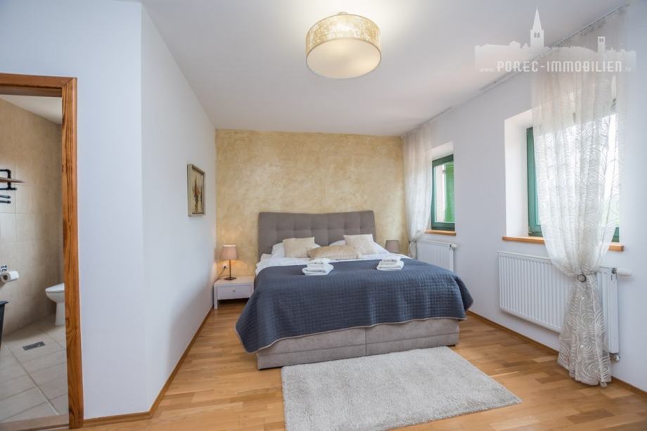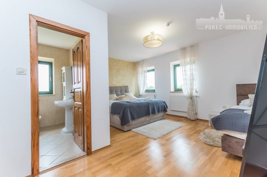 Na katu se nalaze još tri spavaće sobe, svaka s vlastitom kupaonicom. Prvi kat dostupan je kako unutarnjim, tako i vanjskim stubištem, što dodatno povećava funkcionalnost objekta.