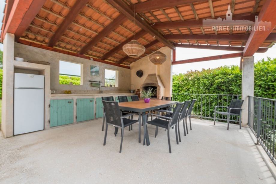 Okućnica je lijepo uređena, lako održiva i opremljena natkrivenom vanjskom kuhinjom te natkrivenim parkingom.