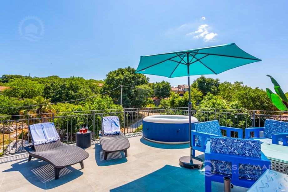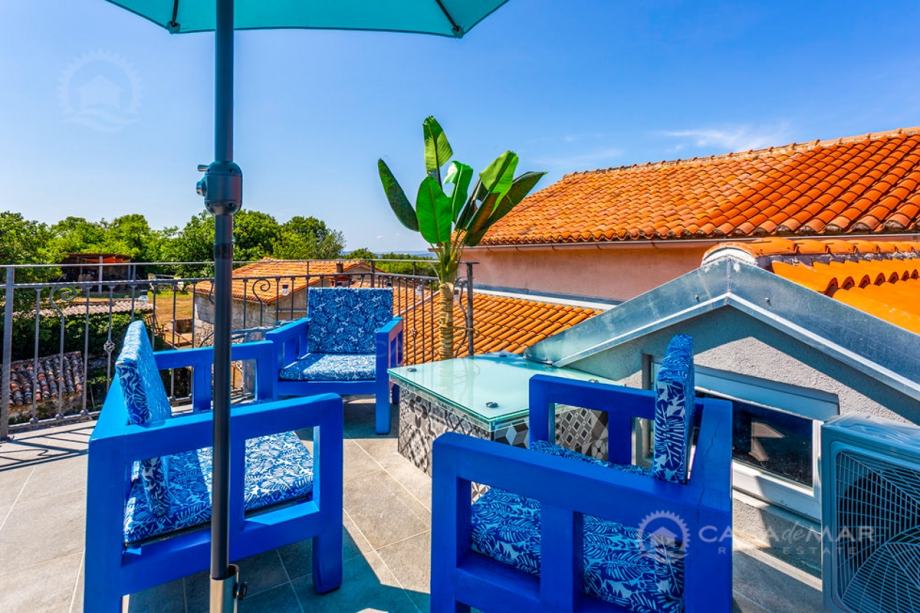 Ukupne stambene površine od 80 m², proteže se kroz prizemlje i prvi kat. Prizemlje se sastoji od dnevnog boravka, kuhinje s blagovaonicom te kupaonice, dok unutarnje stepenište vodi na prvi kat s dvije spavaće sobe i dodatnom kupaonicom. S kata se vanjskim stepenicama izlazi na krovnu terasu – idealno mjesto za opuštanje i uživanje u ljetnim večerima. Kuća također ima natkrivenu terasu s roštiljem ispred ulaza, što omogućava boravak na otvorenom čak i u toplim ljetnim mjesecima.