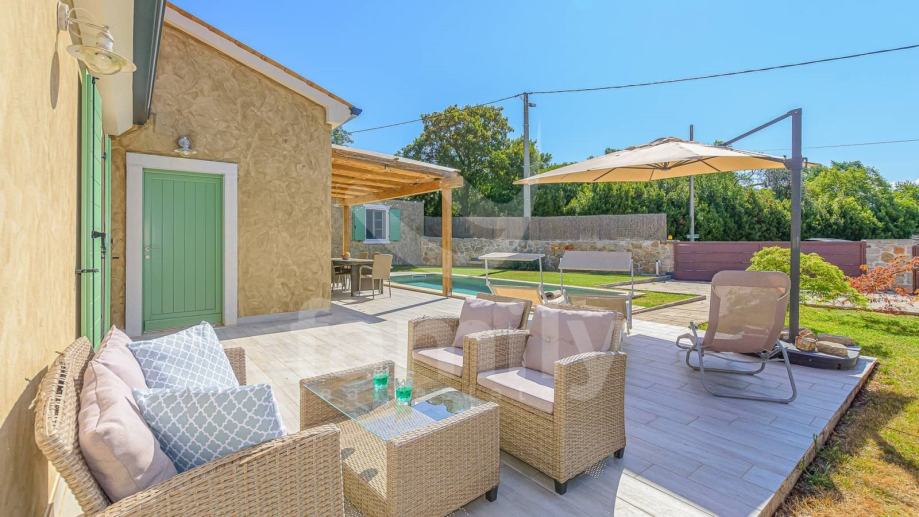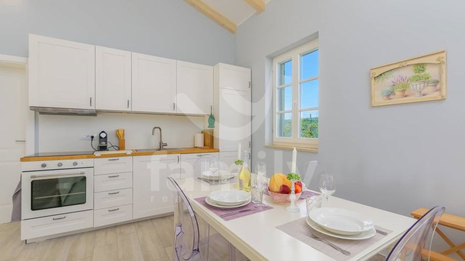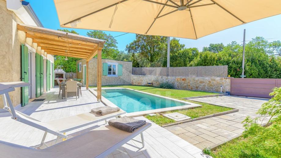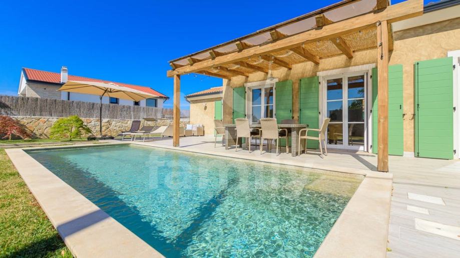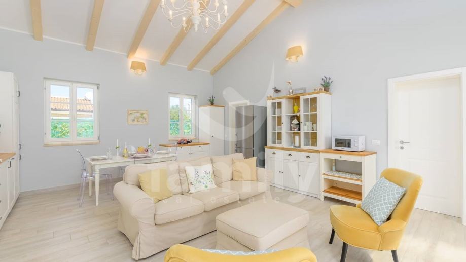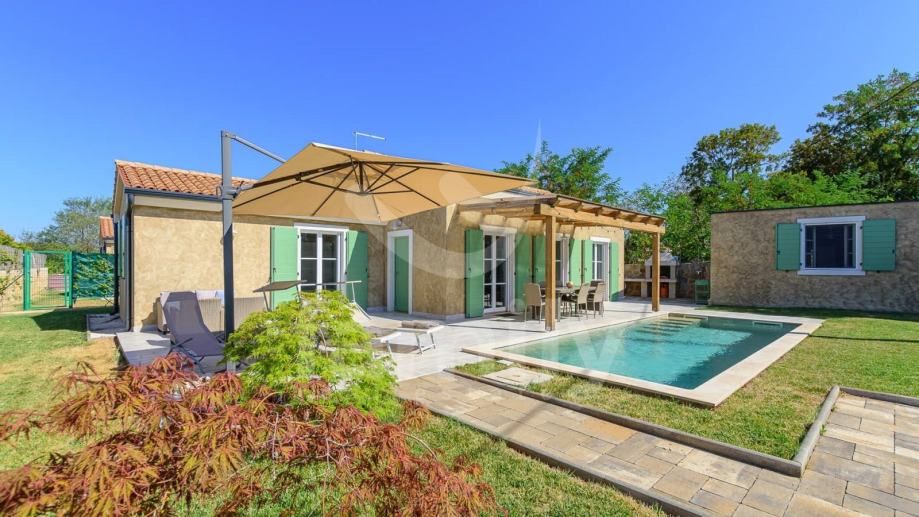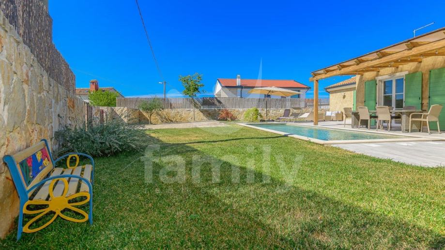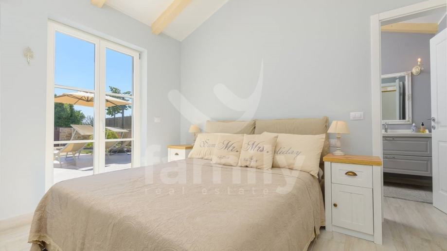 Nedaleko od Rovinja, na svega desetak minuta vožnje, a u jednom mirnom i luksuznom naselju nalazi se ova prostrana, autentična vila ukupne površine 110 m2 sa okućnicom površine 400 m2. Glavni dio vile se sastoji od prostranog dnevnog boravka koji je lijepo osvijetljen i sa kojeg se izlazi na natkrivenu terasu i okućnicu, blagovaone i kuhinje, dvije spavaće sobe sa vlastitim kupaonicama te se pored nalazi još jedan objekt cca 20 m2 sa spavaćom sobom i kupaonicom. Postavljena je kvalitetna PVC stolarija, a sustav grijanja i hlađenja reguliran je sa jedinicama klima uređaja u svakoj prostoroji i sobi. Tijekom opremanja nekretnine pazilo se na svaki detalj te su u prostorijama postavljene grede, a namještaj je u moderno - rustikalnom stilu za dodatnu čar uživanja u istarskom štihu. Okućnica je pomno održavana te se na njoj smjestio grijani bazen površine 24 m2 kao i natkrivena osunčana terasa, sunčalište roštilj i vanjski sudoper, a sve je ograđeno kamenim suhozidom.