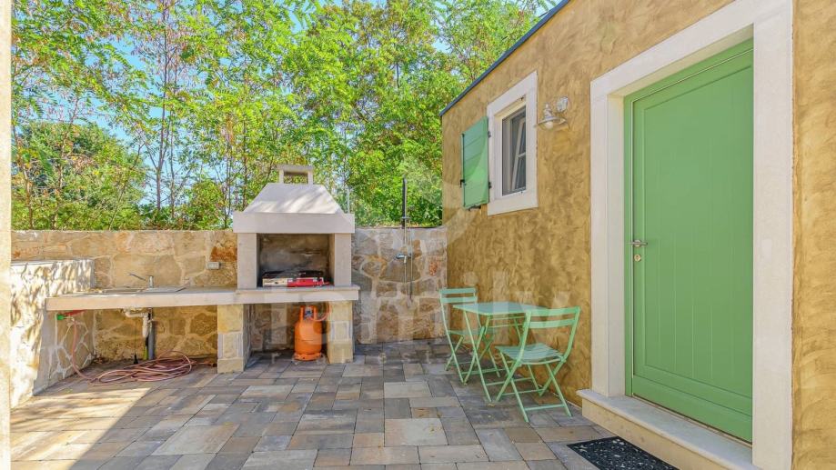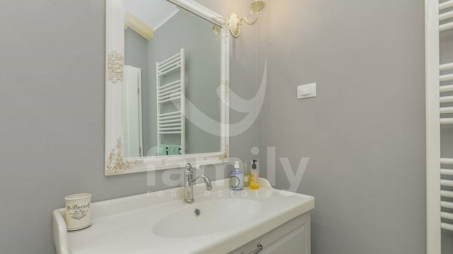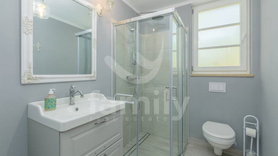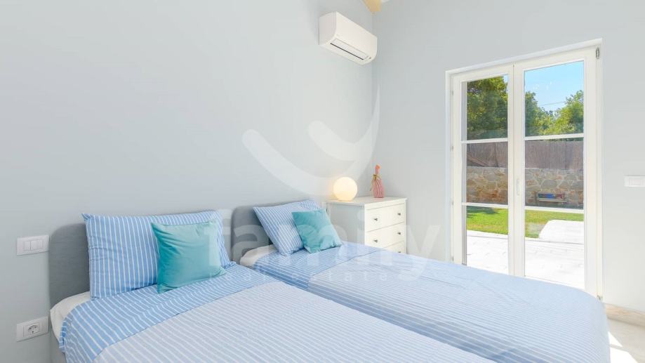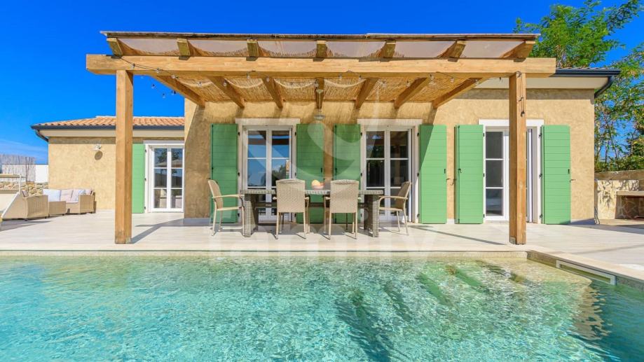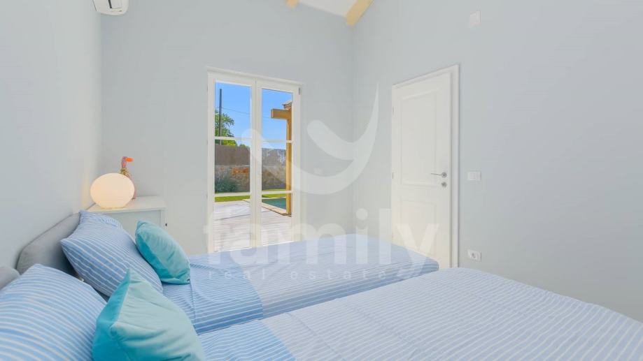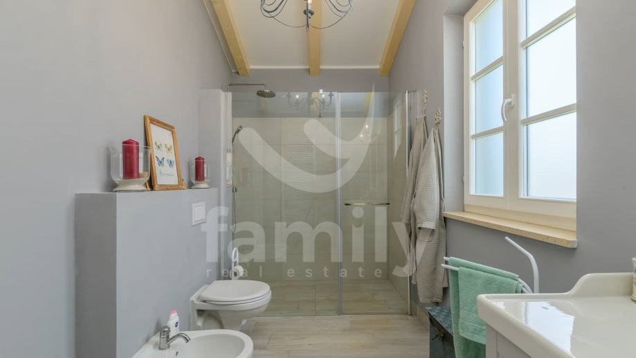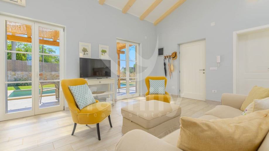 Nedaleko od Rovinja, na svega desetak minuta vožnje, a u jednom mirnom i luksuznom naselju nalazi se ova prostrana, autentična vila ukupne površine 110 m2 sa okućnicom površine 400 m2. Glavni dio vile se sastoji od prostranog dnevnog boravka koji je lijepo osvijetljen i sa kojeg se izlazi na natkrivenu terasu i okućnicu, blagovaone i kuhinje, dvije spavaće sobe sa vlastitim kupaonicama te se pored nalazi još jedan objekt cca 20 m2 sa spavaćom sobom i kupaonicom. Postavljena je kvalitetna PVC stolarija, a sustav grijanja i hlađenja reguliran je sa jedinicama klima uređaja u svakoj prostoroji i sobi. Tijekom opremanja nekretnine pazilo se na svaki detalj te su u prostorijama postavljene grede, a namještaj je u moderno - rustikalnom stilu za dodatnu čar uživanja u istarskom štihu. Okućnica je pomno održavana te se na njoj smjestio grijani bazen površine 24 m2 kao i natkrivena osunčana terasa, sunčalište roštilj i vanjski sudoper, a sve je ograđeno kamenim suhozidom.
