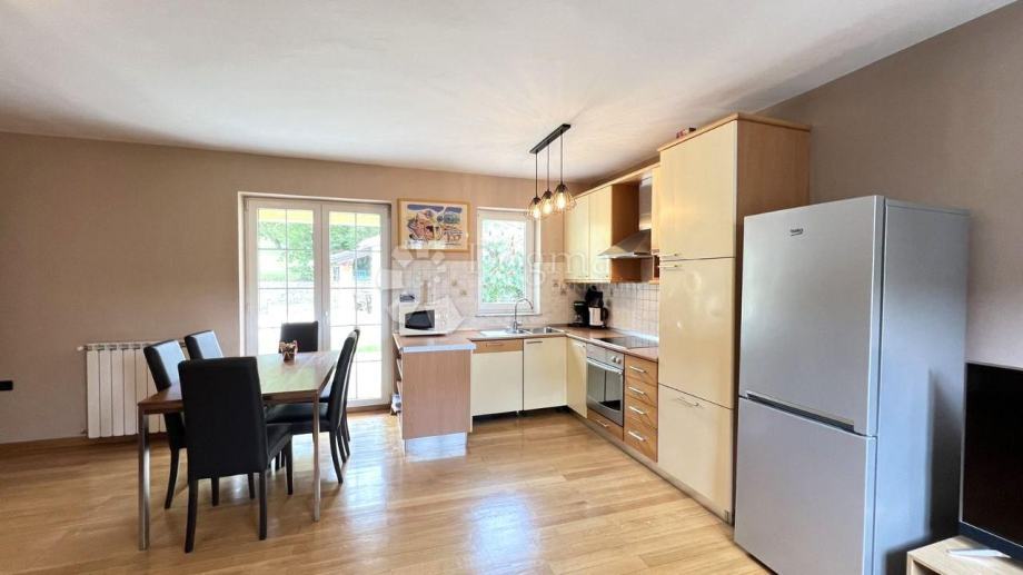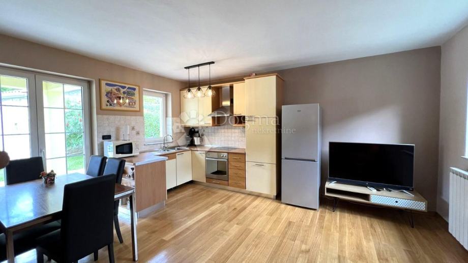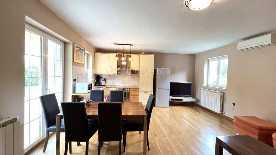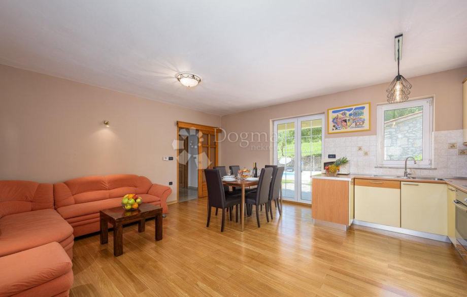 Modernu kuhinju s blagovaonicom i dnevnim boravkom, iz kojih se izlazi na prostranu terasu.