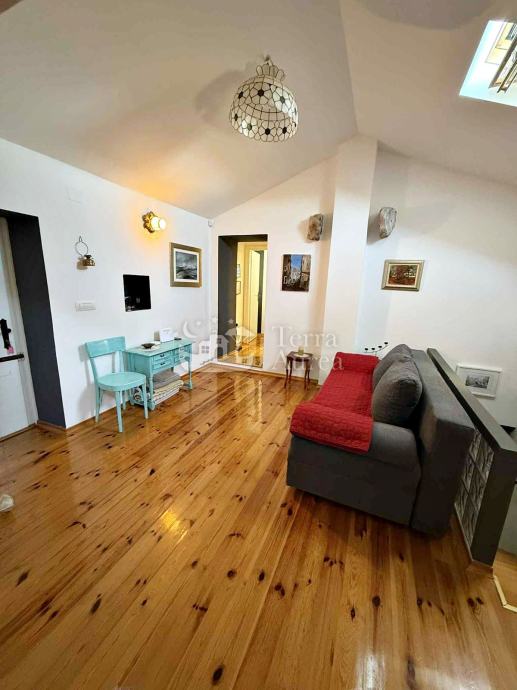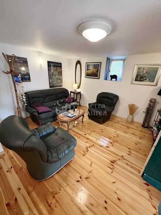 Prizemlje odiše starinskom elegancijom uz detalje poput peći na drva koja dominira prostorom te unosi posebnu toplinu u prostrani dnevni boravak povezan s kuhinjom i blagovaonicom. Izlaz na natkrivenu terasu vodi do uređenog dvorišta u kojem se ističe bazen sa slanom vodom i sunčalištem – savršeno mjesto za opuštanje, druženje i uživanje u blagodatima prirode.