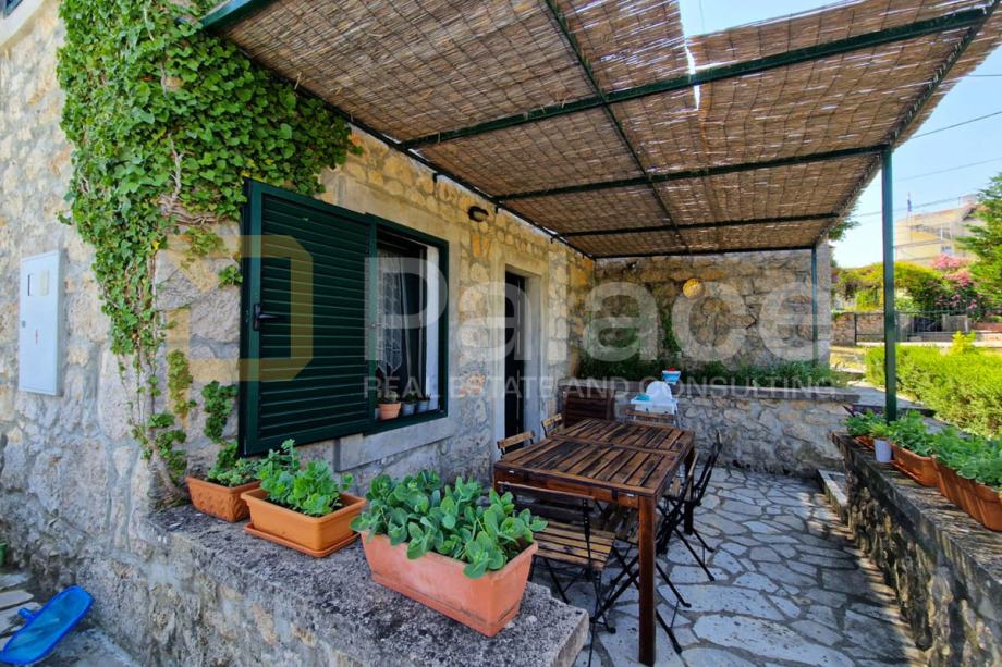 Uređena okućnica od 744 m² krije brojne mediteranske biljke, sunčalište i bazen površine 35 m², savršen za ljetno opuštanje. U dvorištu se nalazi i praktična vanjska ostava, kao i vanjski WC. Osiguran je prostor za čak osam automobila, što je rijetkost i velika prednost, osobito u turističkoj sezoni. Udaljenost do prve trgovine iznosi svega 200 metara, što dodatno doprinosi svakodnevnoj praktičnosti.