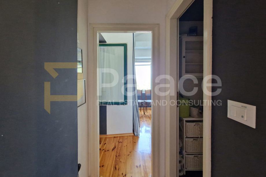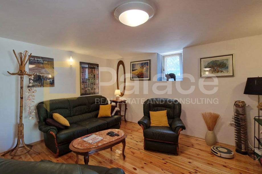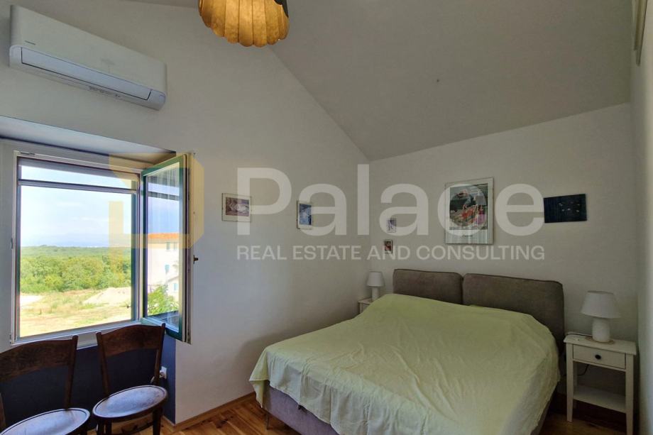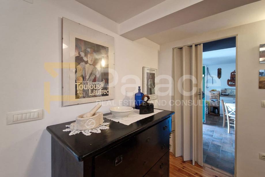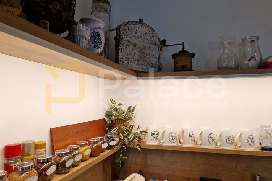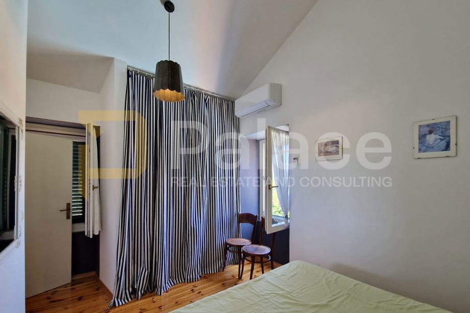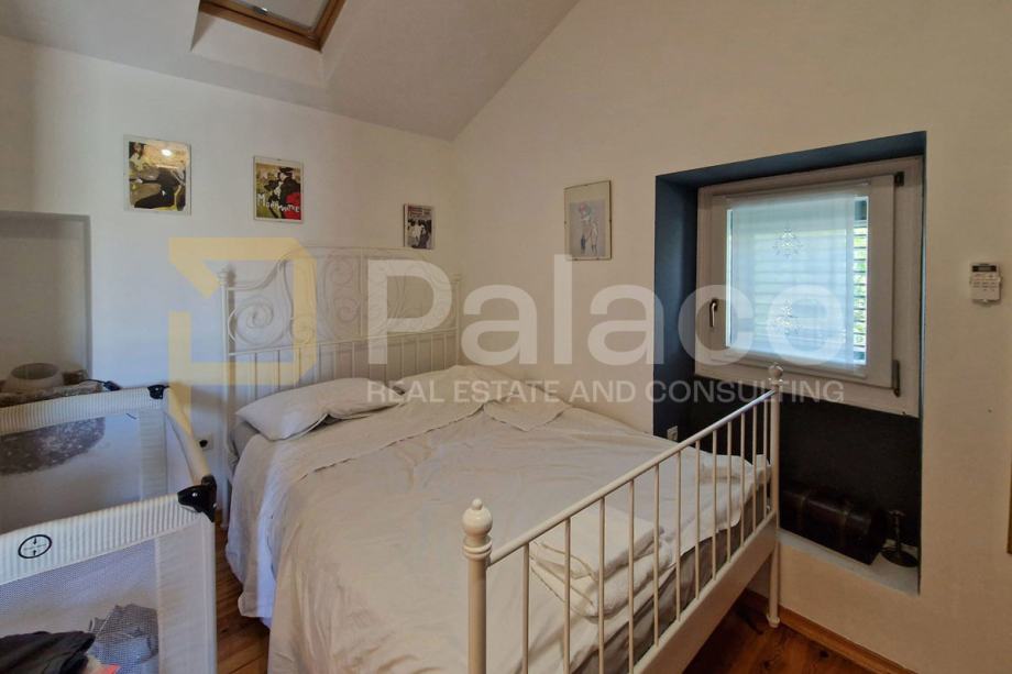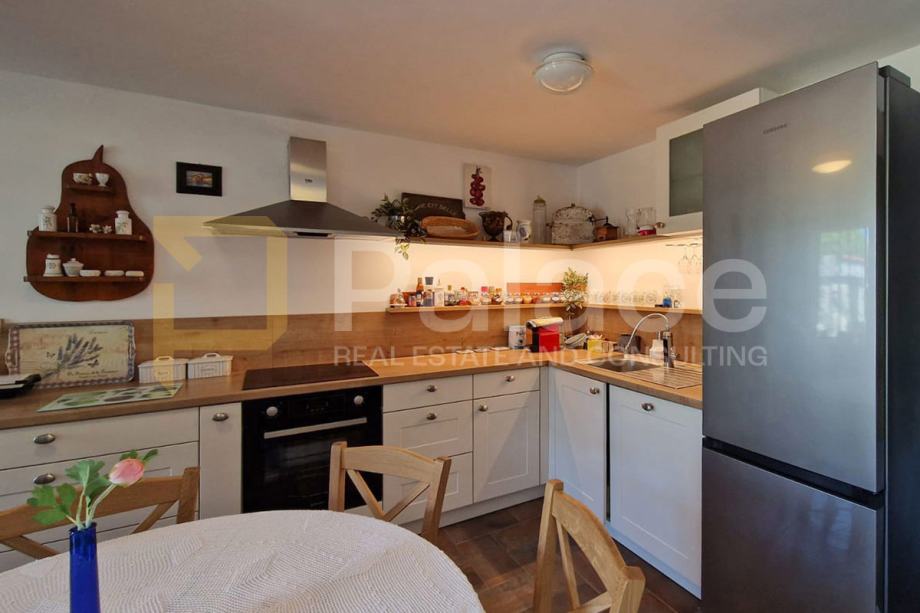 Kuća se prostire na dvije etaže ukupne površine 104 m², a smještena je na prostranom zemljištu veličine 913 m². U prizemlju se nalazi otvoreni dnevni boravak s blagovaonom i potpuno novom kuhinjom, dok unutarnje stepenice vode na kat gdje su smještene dvije spavaće sobe, kupaonica i predsoblje s dodatnim ležajem. Posebna pažnja posvećena je očuvanju izvornih detalja u kombinaciji s novim, kvalitetnim namještajem, što prostoru daje autentičan karakter i osjećaj topline.