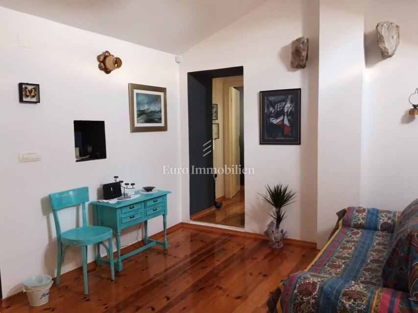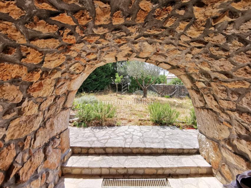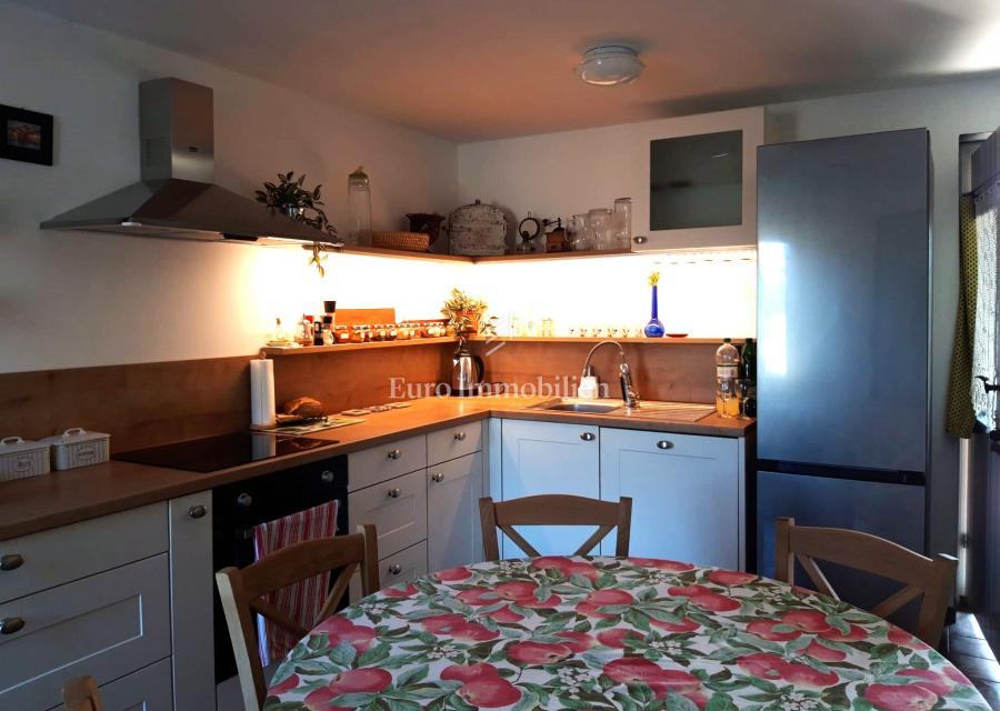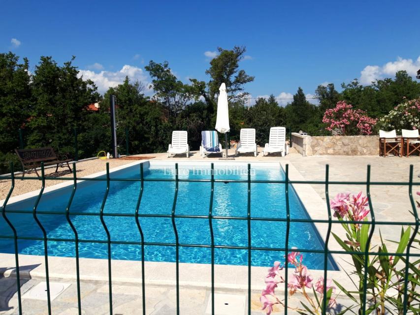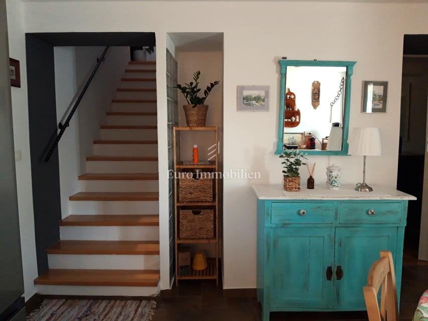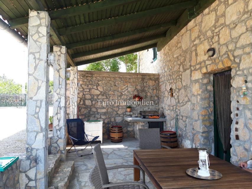 Kuća površine 100 m2 proteže kroz prizemlje i kat. U prizemlju se nalazi dnevni boravak s blagovaonicom i kuhinjom i velika natkrivena terasa povezana s uređenom okućnicom. Unutarnjim stepenicama dolazi se na kat gdje se nalaze dvije spavaće sobe i kupaonica. Pri renovaciji nekretnine su zadržani izvorni karakter i posebnost kamene kuće. Na uređenoj okućnici je bazen površine 35 m2 sa sunčalištem i vanjsko spremište. Na ulaznom dijelu dvorišta je parking za nekoliko vozila.