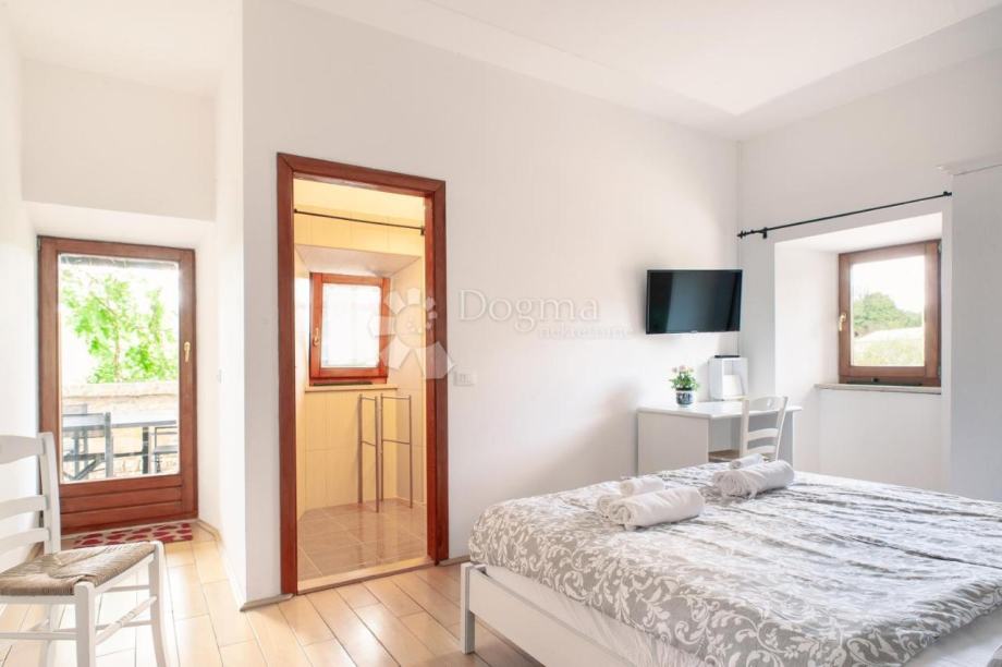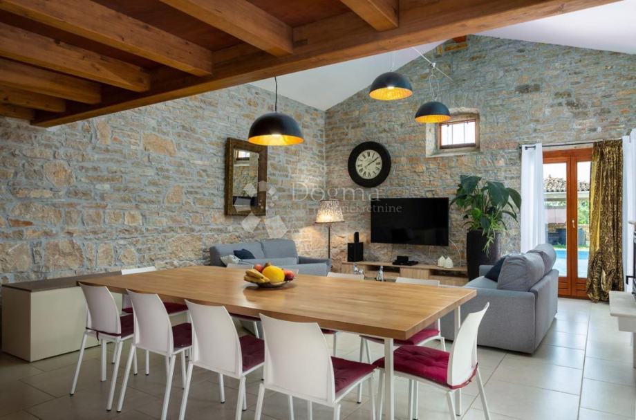 Kombinira autentične elemente, poput originalnih kamenih zidova, bijelih stropnih greda i drvenih podova, stvarajući toplu i elegantnu atmosferu. Vila se sastoji od dvije kamene kuće spojene u jednu, a njezin interijer oduševljava svojim prostorom i luksuzom.
