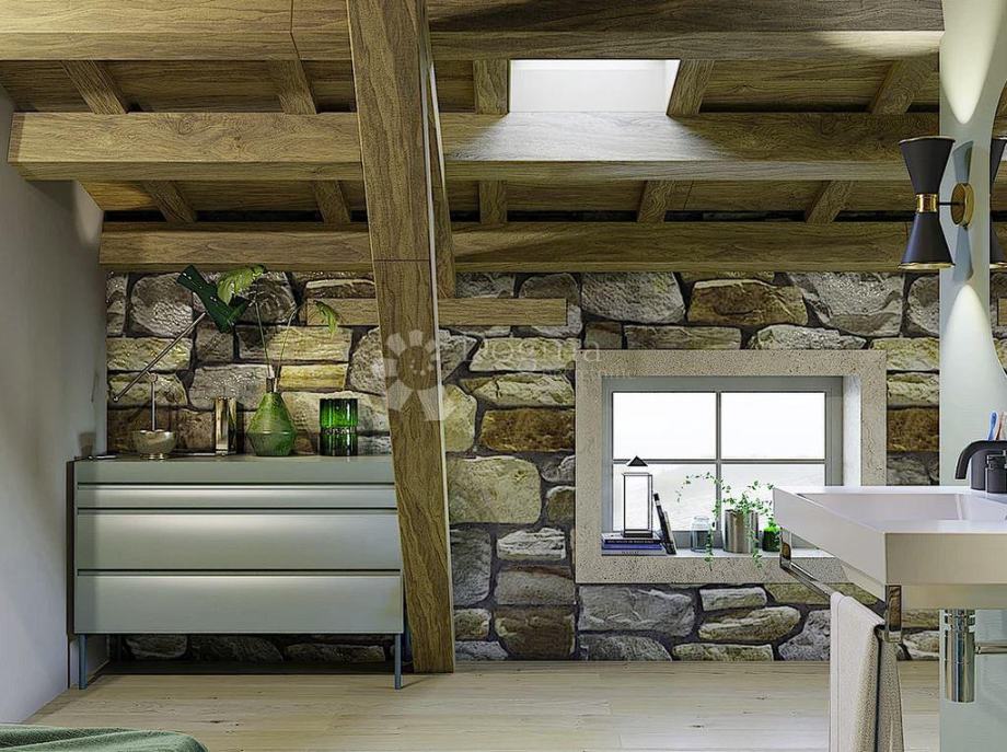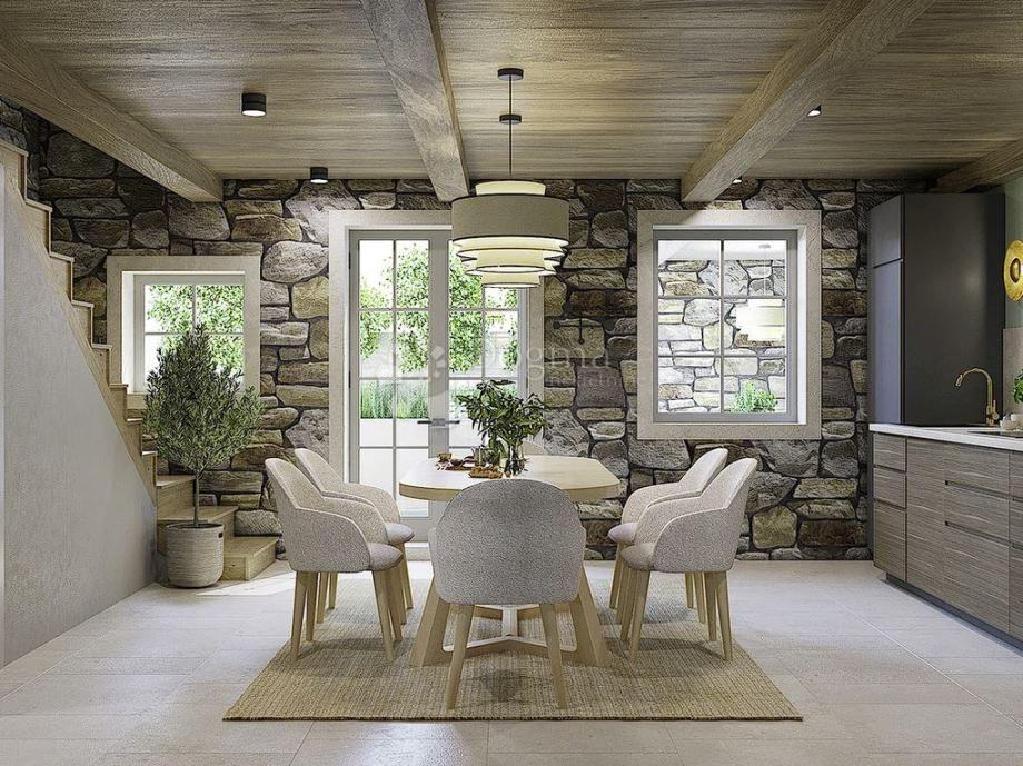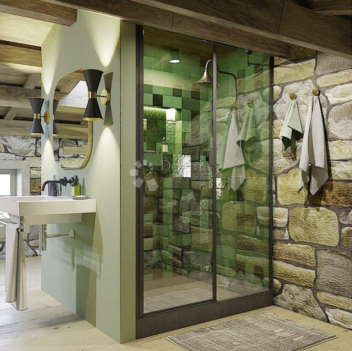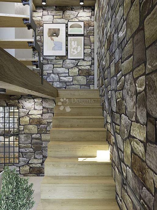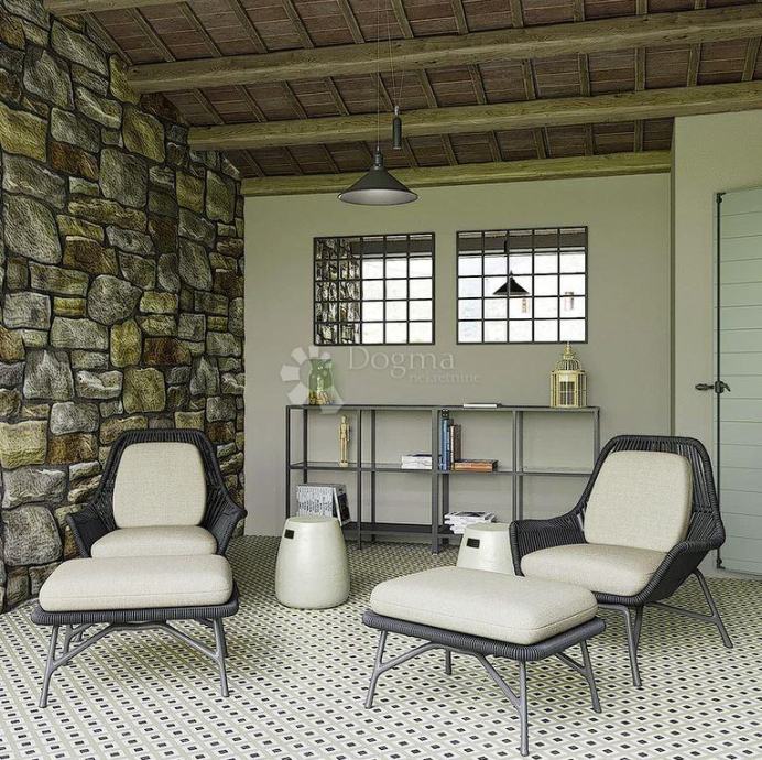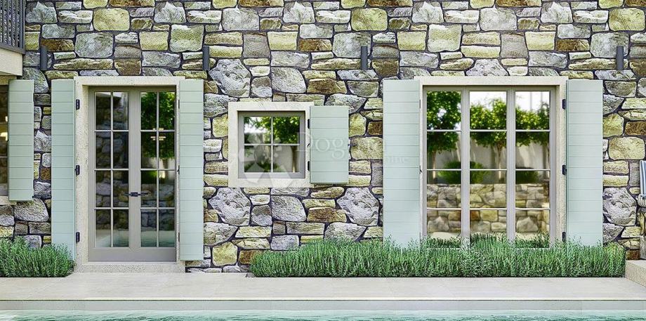 Imanje je ograđeno kamenim zidom, osiguravajući privatnost i mir, dok će se bujna zelenila posaditi kao prirodna živica. Vrt i prizemlje su ukrašeni autohtonim istarskim kamenom, a vanjska stolarija je izrađena od drveta, naglašavajući skladan spoj tradicije i suvremenog dizajna.