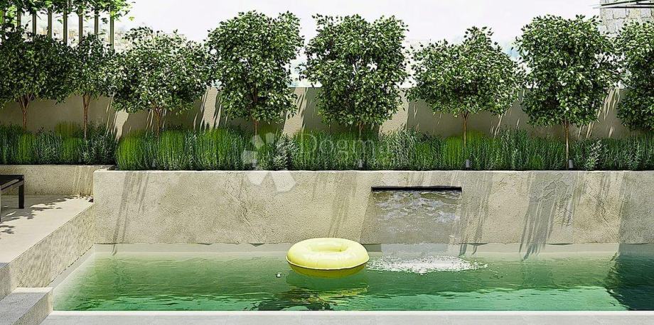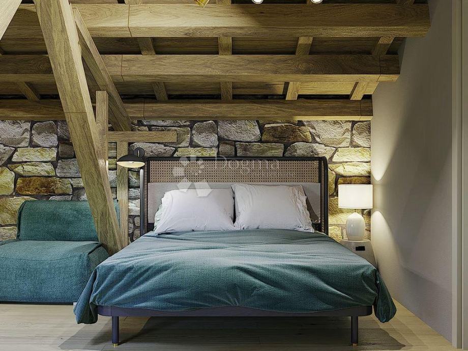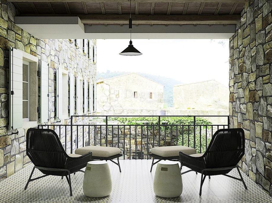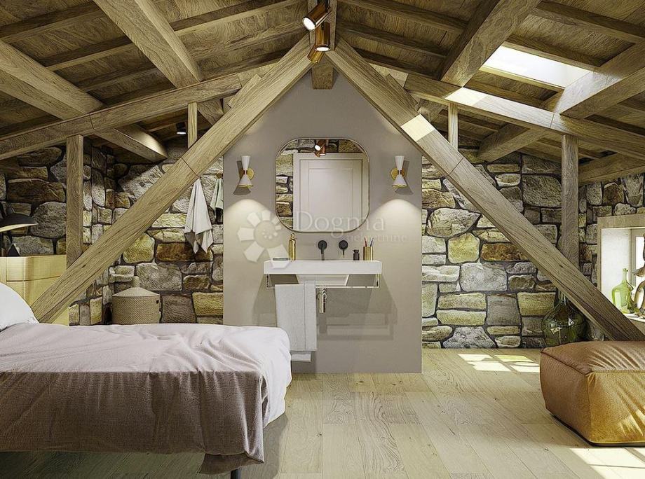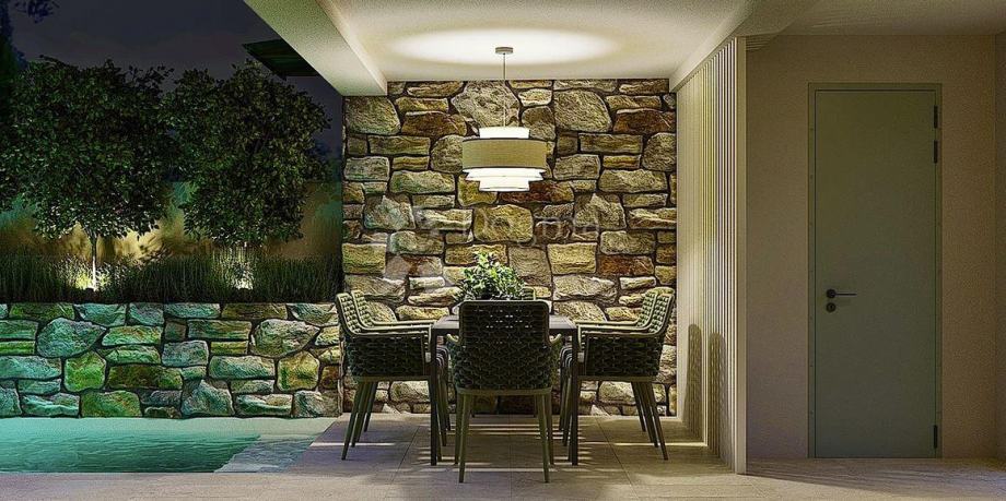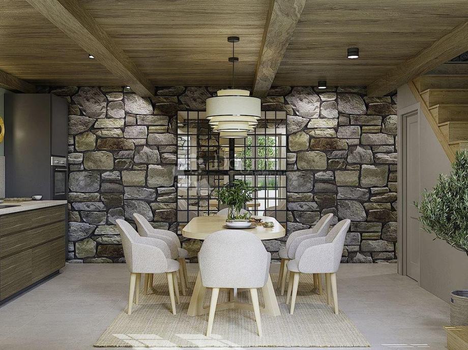 Imanje je ograđeno kamenim zidom, osiguravajući privatnost i mir, dok će se bujna zelenila posaditi kao prirodna živica. Vrt i prizemlje su ukrašeni autohtonim istarskim kamenom, a vanjska stolarija je izrađena od drveta, naglašavajući skladan spoj tradicije i suvremenog dizajna.